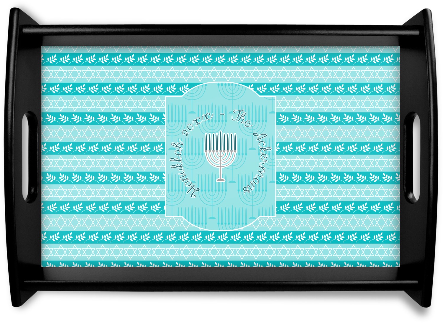 The design is a beautiful set of different shades of teal. You will see three different patterns used throughout this design. One with stripes, olive branches, and stars of David, one with menoras, and the last with doves, menoras, olive branches, and stars of David. The main design has a tall frame with your personalization and a menora graphic in the middle.