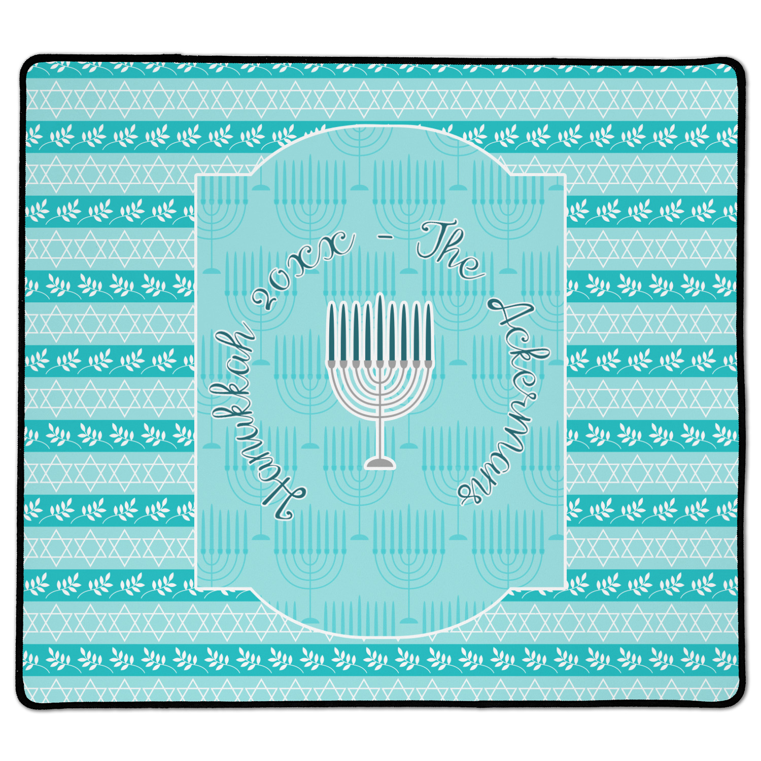 The design is a beautiful set of different shades of teal. You will see three different patterns used throughout this design. One with stripes, olive branches, and stars of David, one with menoras, and the last with doves, menoras, olive branches, and stars of David. The main design has a tall frame with your personalization and a menora graphic in the middle.