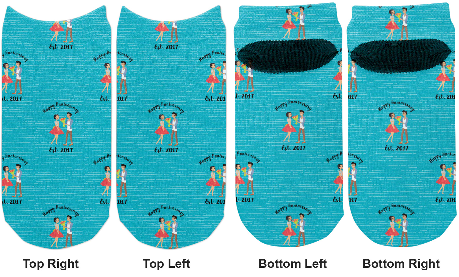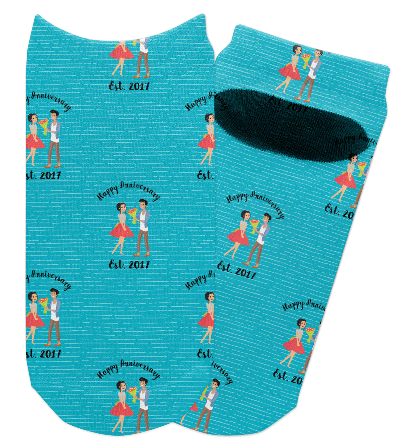The design has a fun bright teal background with some subtle teal stripes running through. In the middle of the design is where your couple graphic is placed. Easily change the skin tone and hair color of this couple in love. Above and below the couple you can personalize the text to say "happy anniversary" or your names and your anniversary date. The coordinating design uses the couple graphic as a repeating pattern.