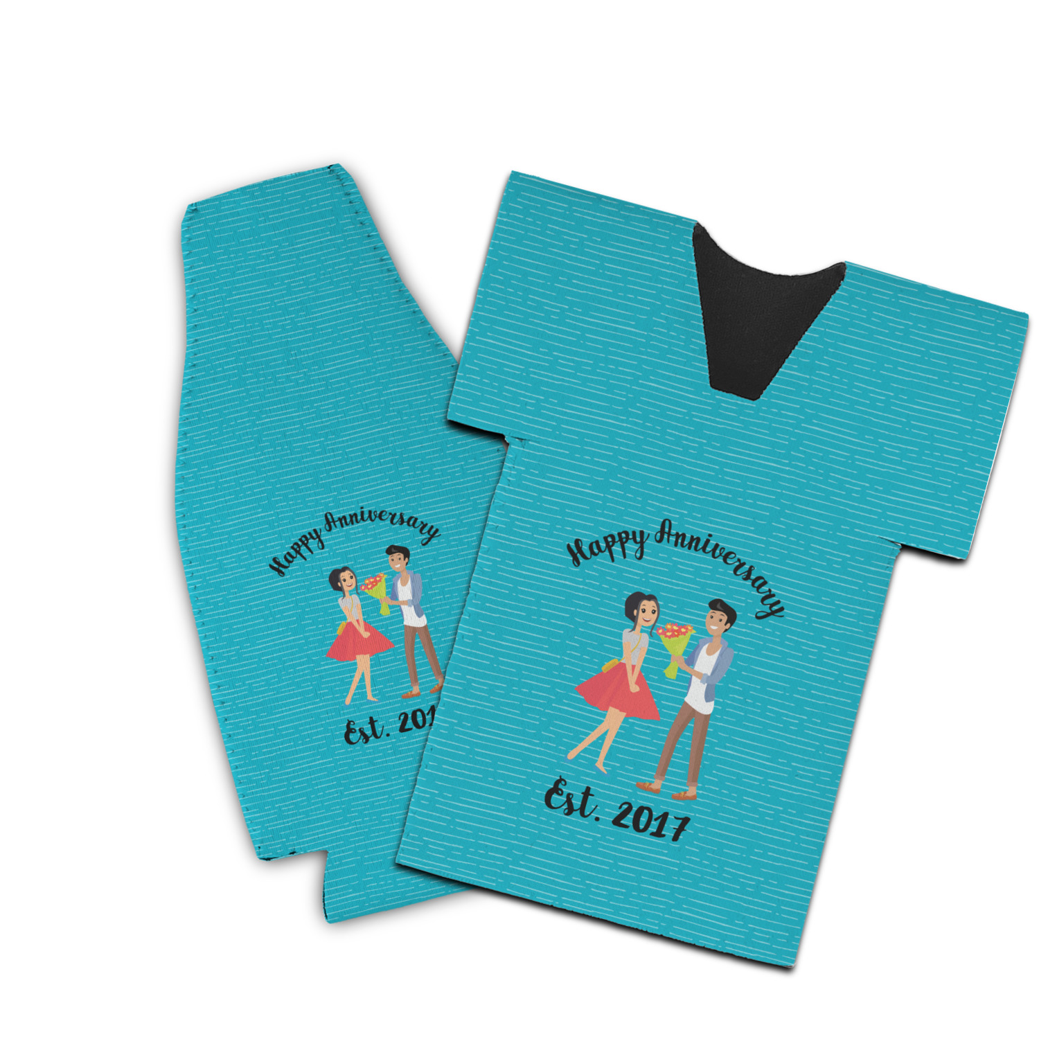The design has a fun bright teal background with some subtle teal stripes running through. In the middle of the design is where your couple graphic is placed. Easily change the skin tone and hair color of this couple in love. Above and below the couple you can personalize the text to say "happy anniversary" or your names and your anniversary date. The coordinating design uses the couple graphic as a repeating pattern.