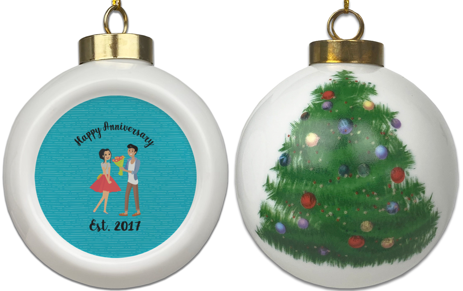 Our Christmas ornaments are a unique ceramic ball shape with a twist as it has a flat face to display your custom design! Select from one of our two design types - Christmas Tree or Poinsettia Garland - to adorn the curved back of your personal design. Each ornament measures 3H x 2.5W x 2D accompanied with a gold string accent for finishing touches to hang on your beautiful Christmas tree!