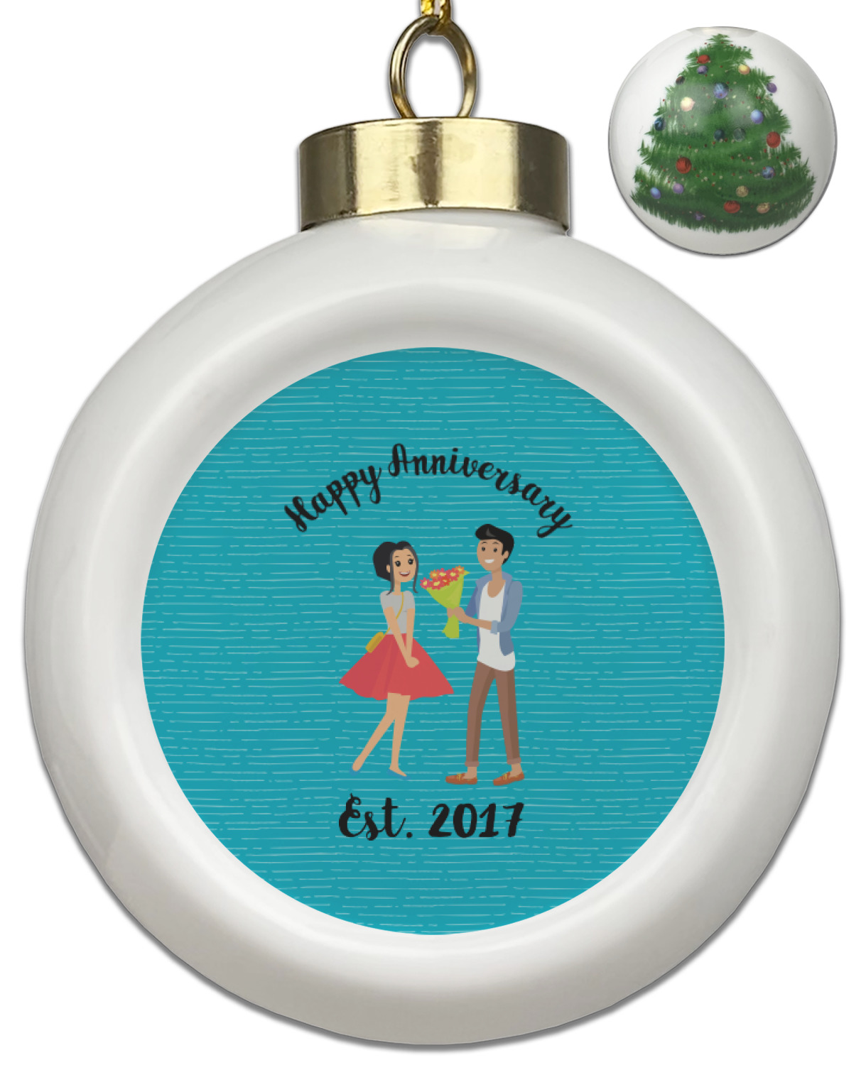 The design has a fun bright teal background with some subtle teal stripes running through. In the middle of the design is where your couple graphic is placed. Easily change the skin tone and hair color of this couple in love. Above and below the couple you can personalize the text to say "happy anniversary" or your names and your anniversary date. The coordinating design uses the couple graphic as a repeating pattern.
