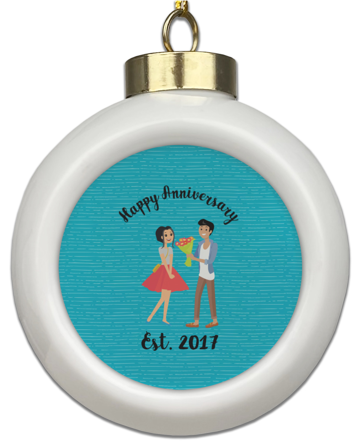 The design has a fun bright teal background with some subtle teal stripes running through. In the middle of the design is where your couple graphic is placed. Easily change the skin tone and hair color of this couple in love. Above and below the couple you can personalize the text to say "happy anniversary" or your names and your anniversary date. The coordinating design uses the couple graphic as a repeating pattern.