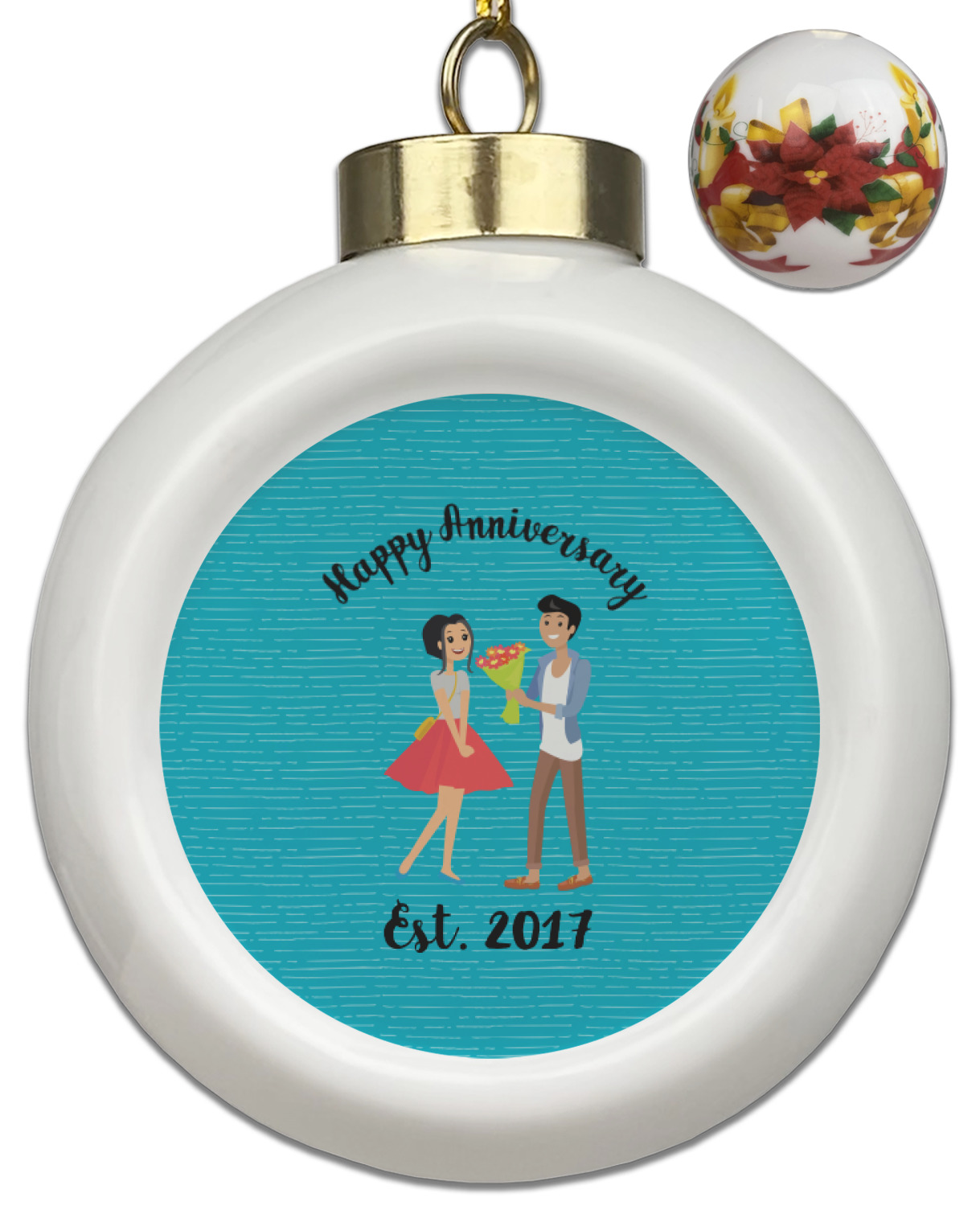 Our Christmas ornaments are a unique ceramic ball shape with a twist as it has a flat face to display your custom design! Select from one of our two design types - Christmas Tree or Poinsettia Garland - to adorn the curved back of your personal design. Each ornament measures 3H x 2.5W x 2D accompanied with a gold string accent for finishing touches to hang on your beautiful Christmas tree!