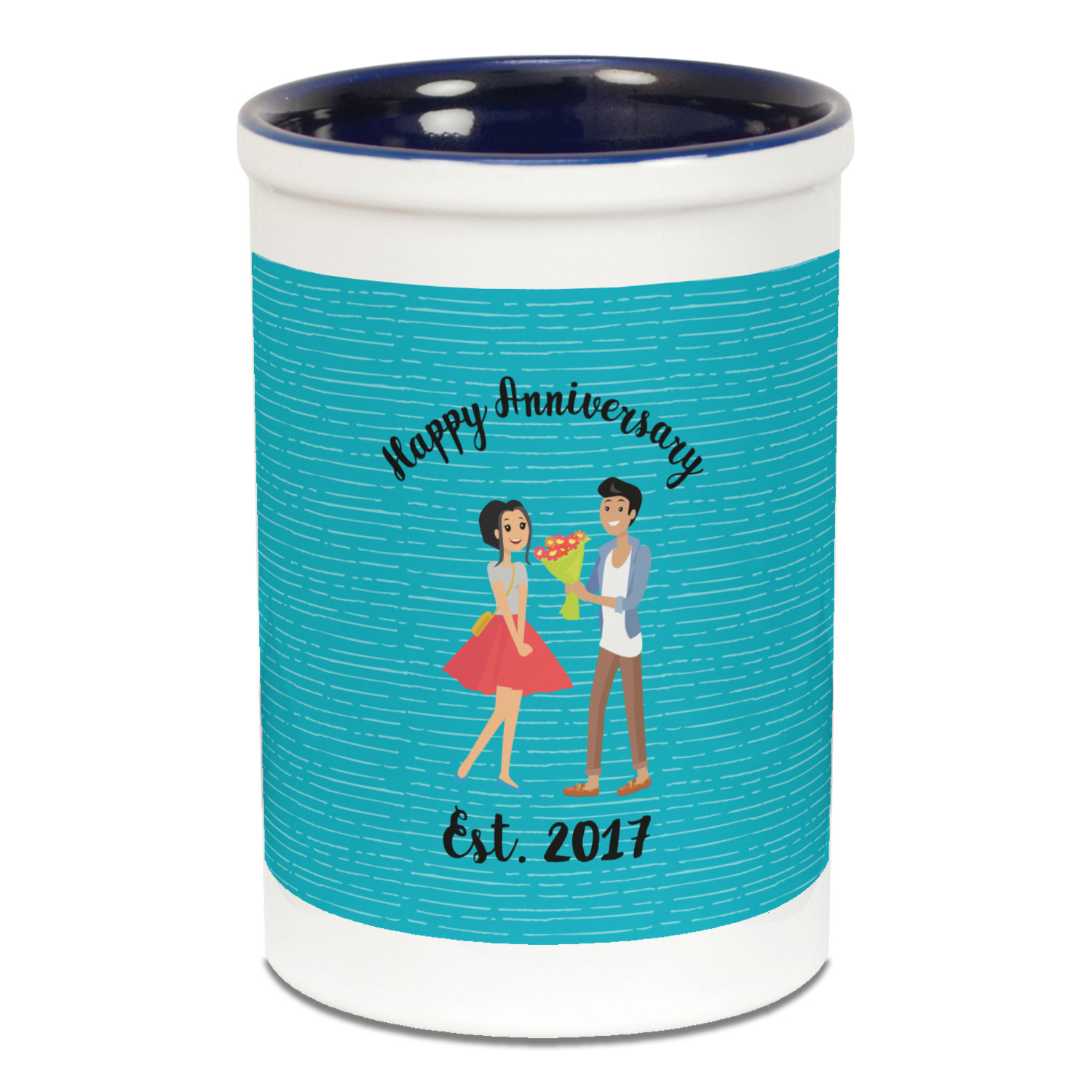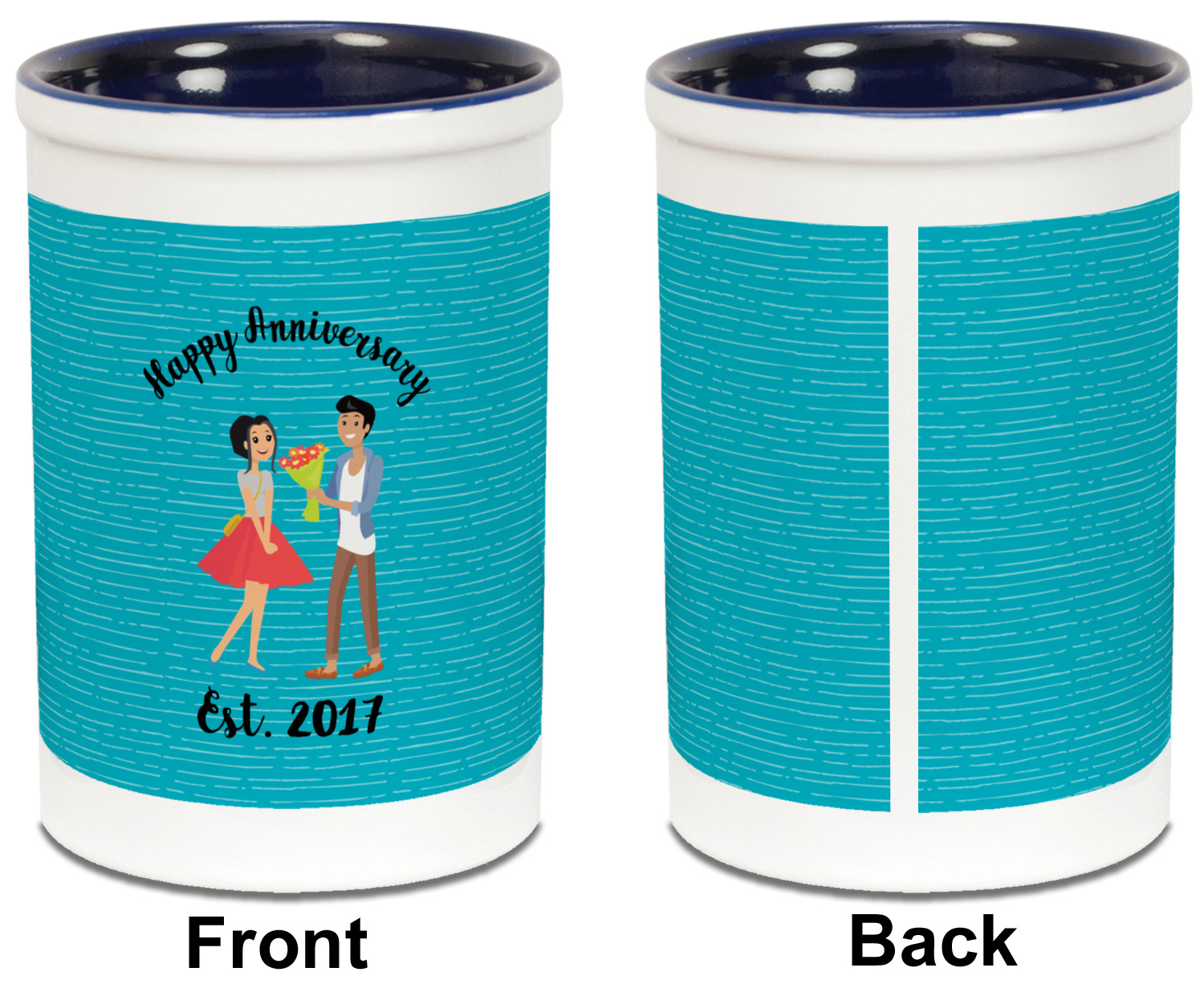 The design has a fun bright teal background with some subtle teal stripes running through. In the middle of the design is where your couple graphic is placed. Easily change the skin tone and hair color of this couple in love. Above and below the couple you can personalize the text to say "happy anniversary" or your names and your anniversary date. The coordinating design uses the couple graphic as a repeating pattern.