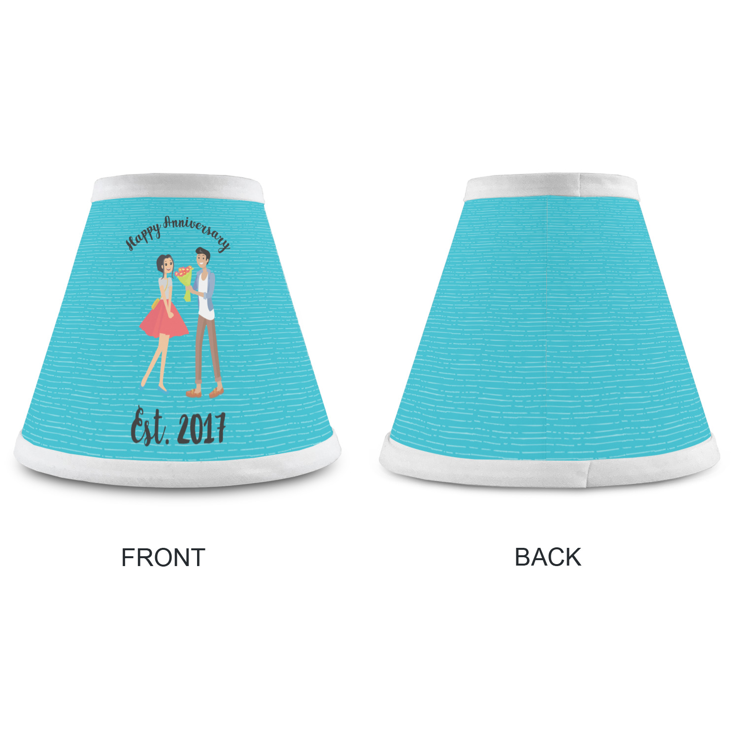 The design has a fun bright teal background with some subtle teal stripes running through. In the middle of the design is where your couple graphic is placed. Easily change the skin tone and hair color of this couple in love. Above and below the couple you can personalize the text to say "happy anniversary" or your names and your anniversary date. The coordinating design uses the couple graphic as a repeating pattern.