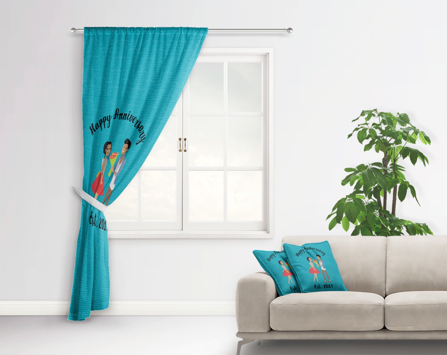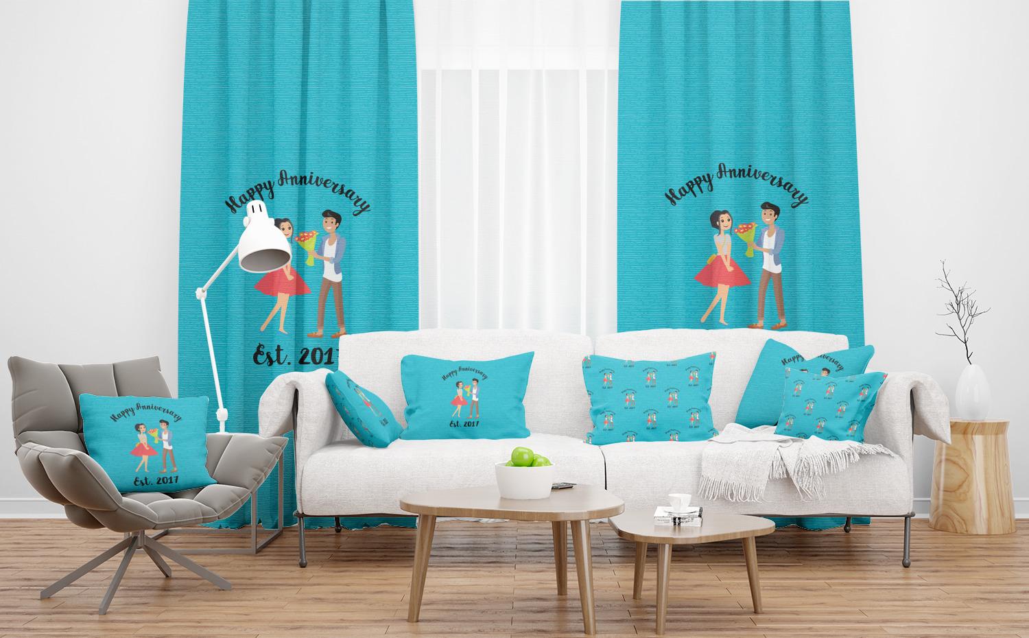 The design has a fun bright teal background with some subtle teal stripes running through. In the middle of the design is where your couple graphic is placed. Easily change the skin tone and hair color of this couple in love. Above and below the couple you can personalize the text to say "happy anniversary" or your names and your anniversary date. The coordinating design uses the couple graphic as a repeating pattern.