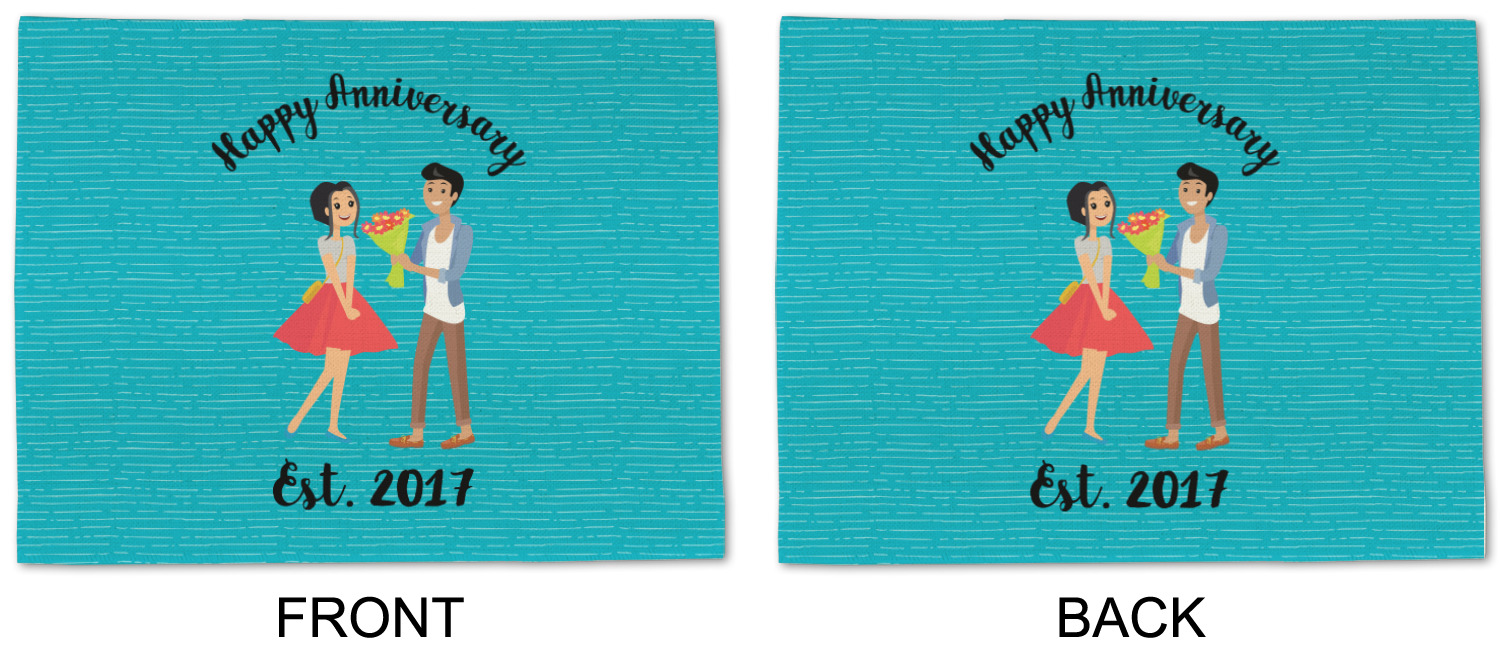 The design has a fun bright teal background with some subtle teal stripes running through. In the middle of the design is where your couple graphic is placed. Easily change the skin tone and hair color of this couple in love. Above and below the couple you can personalize the text to say "happy anniversary" or your names and your anniversary date. The coordinating design uses the couple graphic as a repeating pattern.