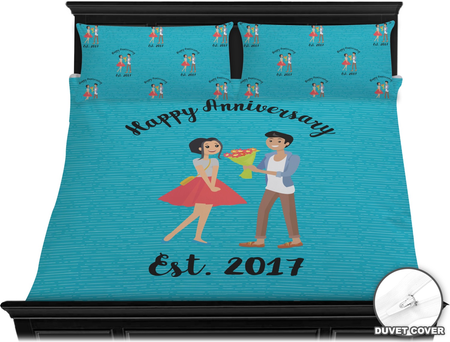 The design has a fun bright teal background with some subtle teal stripes running through. In the middle of the design is where your couple graphic is placed. Easily change the skin tone and hair color of this couple in love. Above and below the couple you can personalize the text to say "happy anniversary" or your names and your anniversary date. The coordinating design uses the couple graphic as a repeating pattern.