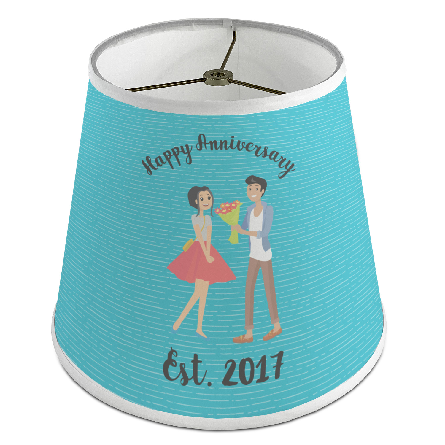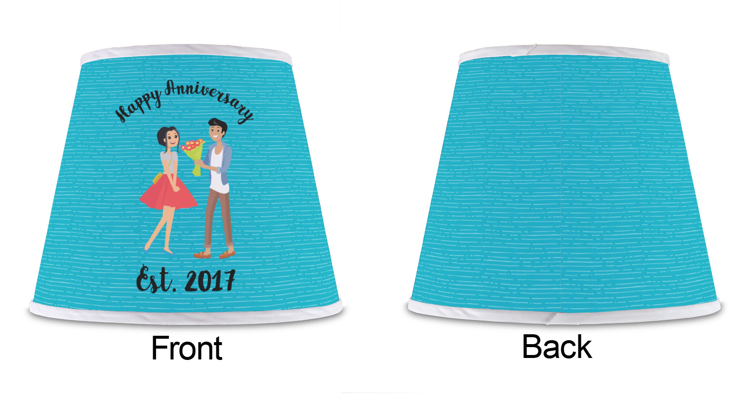 The base of this lampshade is 12 inches in diameter, and the top spans 8 inches in diameter. The total height of the lampshade is 10 inches. The angled nature of this custom lampshade concentrates the light, making it ideal for smaller spaces. This lampshade is made of matte, polyfilm, and displays your customization in its middle. The top and bottom of this colorful lamp shade are lined with a white fabric ribbon (which can be replaced with black inside the design studio) which frames your design and creates a sophisticated finish. As an UNO fitter lampshade, this unique lamp shade will fit a variety of bases.