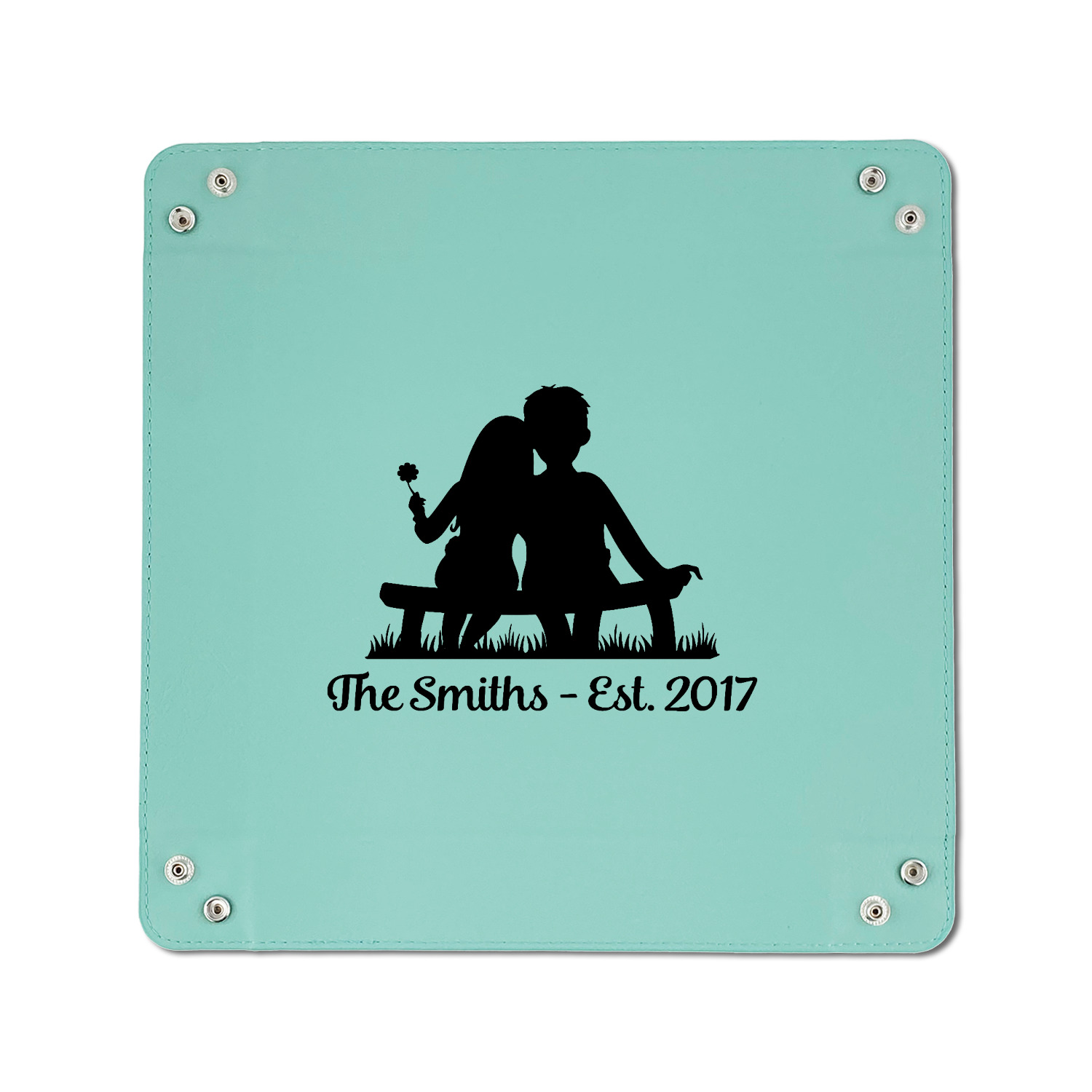 The design has a fun bright teal background with some subtle teal stripes running through. In the middle of the design is where your couple graphic is placed. Easily change the skin tone and hair color of this couple in love. Above and below the couple you can personalize the text to say "happy anniversary" or your names and your anniversary date. The coordinating design uses the couple graphic as a repeating pattern.