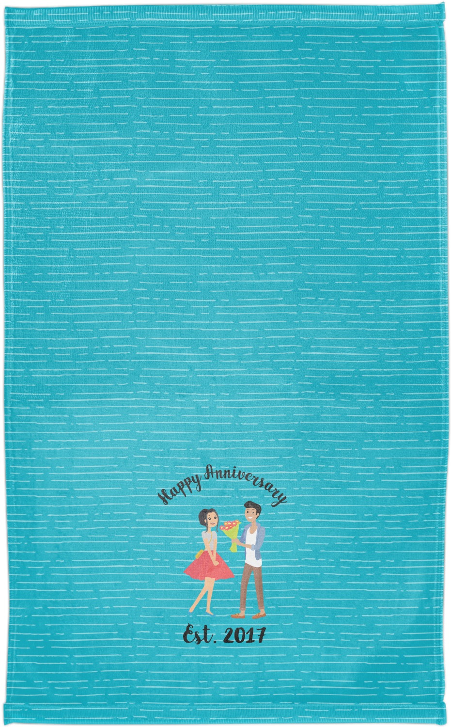The design has a fun bright teal background with some subtle teal stripes running through. In the middle of the design is where your couple graphic is placed. Easily change the skin tone and hair color of this couple in love. Above and below the couple you can personalize the text to say "happy anniversary" or your names and your anniversary date. The coordinating design uses the couple graphic as a repeating pattern.