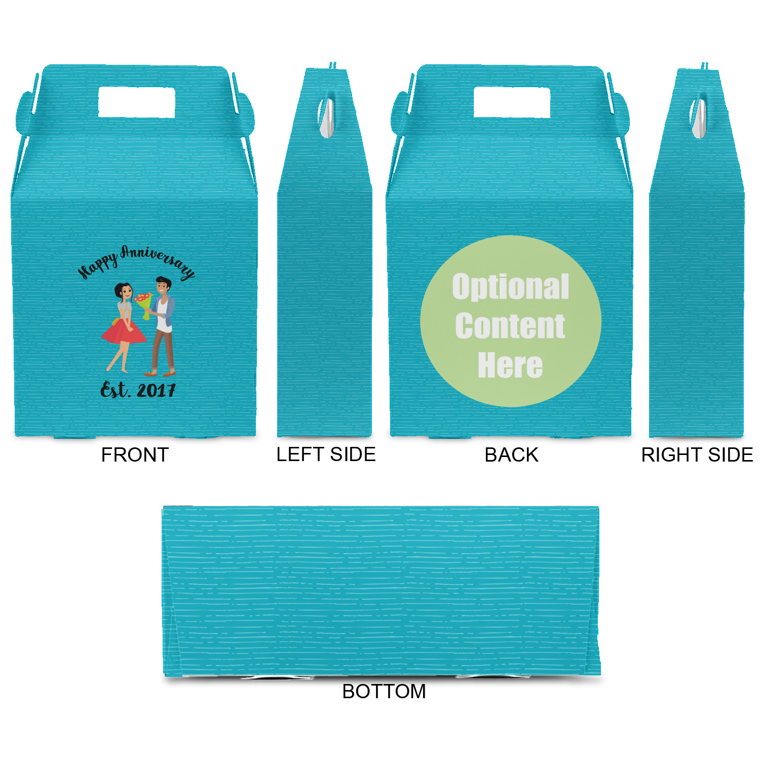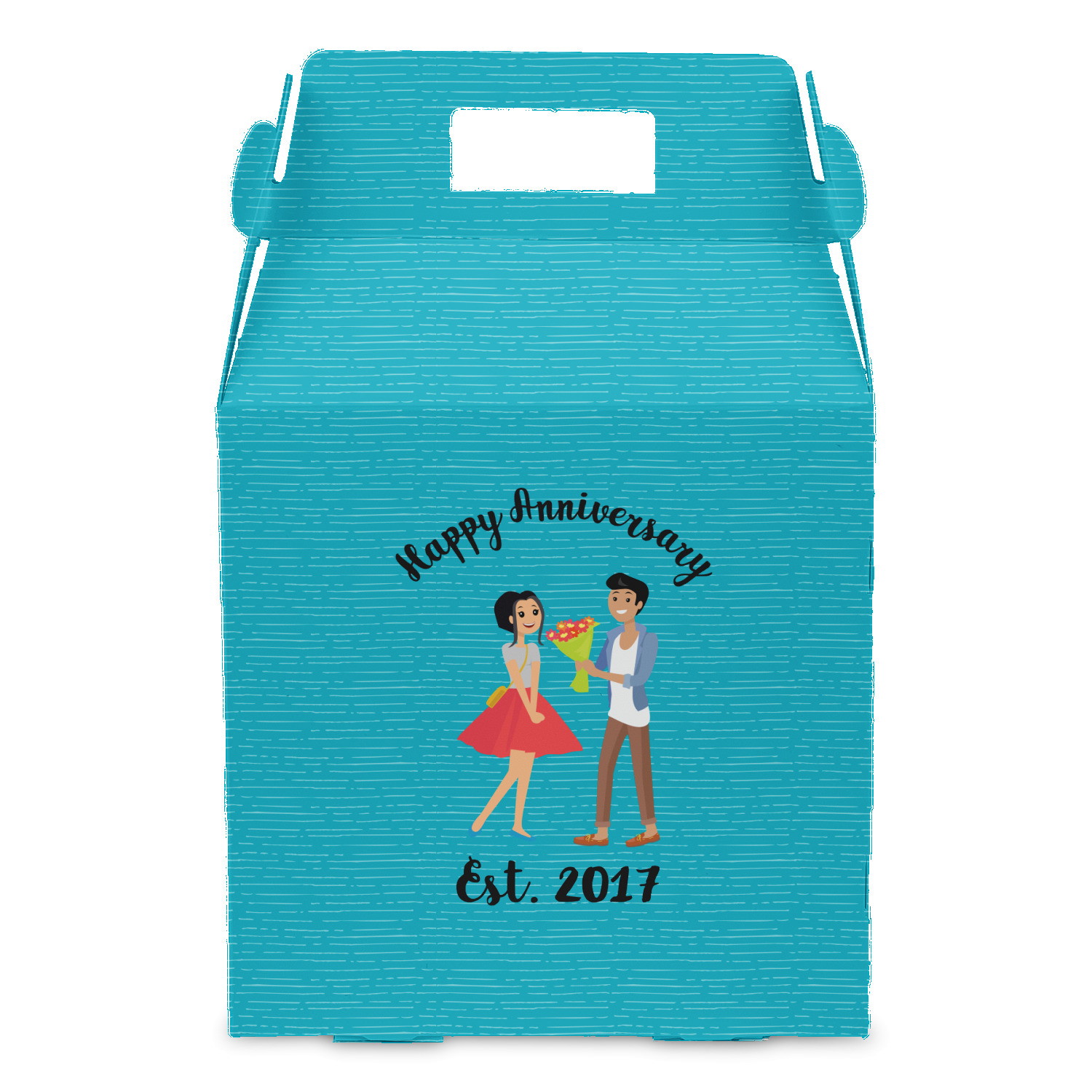 The design has a fun bright teal background with some subtle teal stripes running through. In the middle of the design is where your couple graphic is placed. Easily change the skin tone and hair color of this couple in love. Above and below the couple you can personalize the text to say "happy anniversary" or your names and your anniversary date. The coordinating design uses the couple graphic as a repeating pattern.