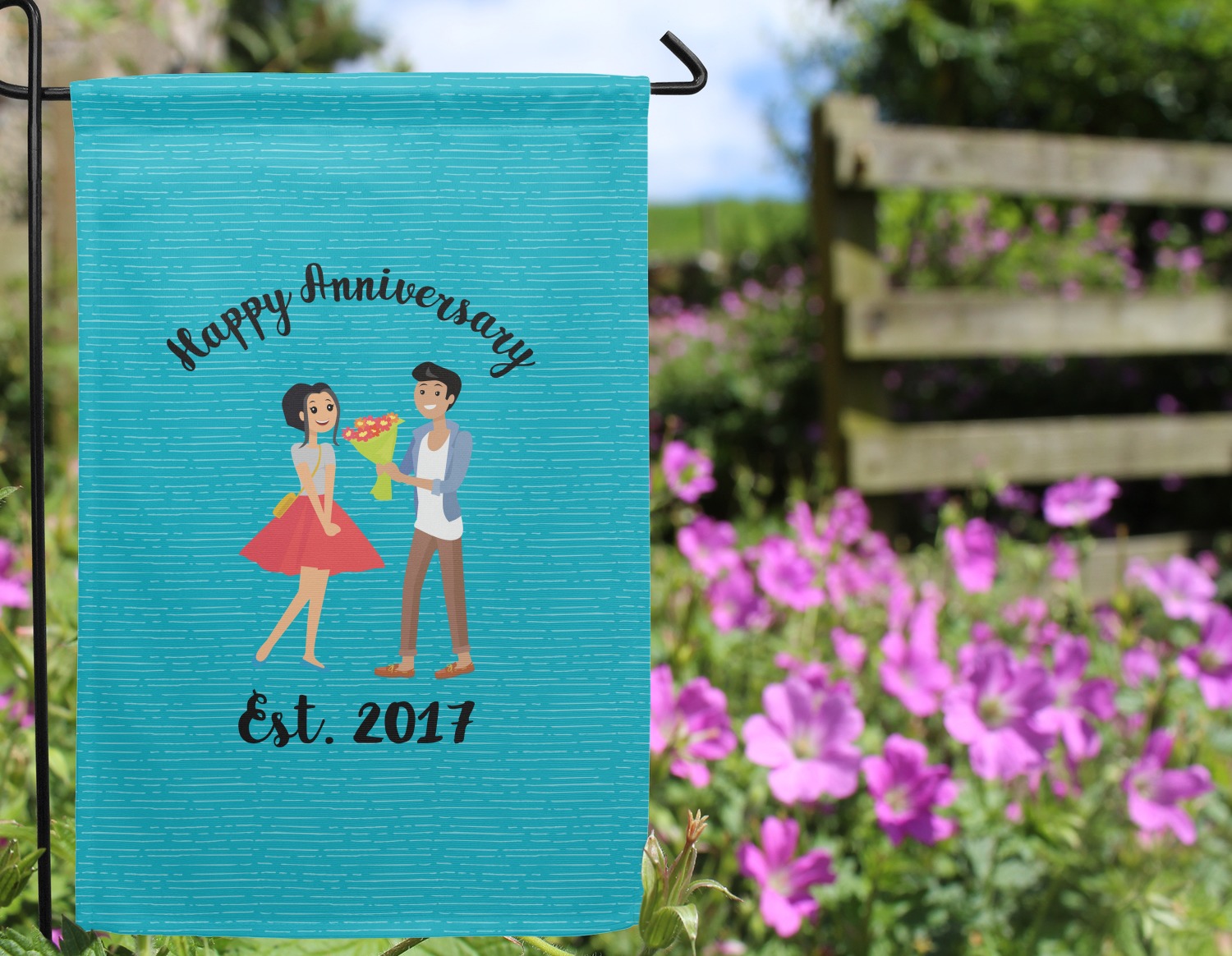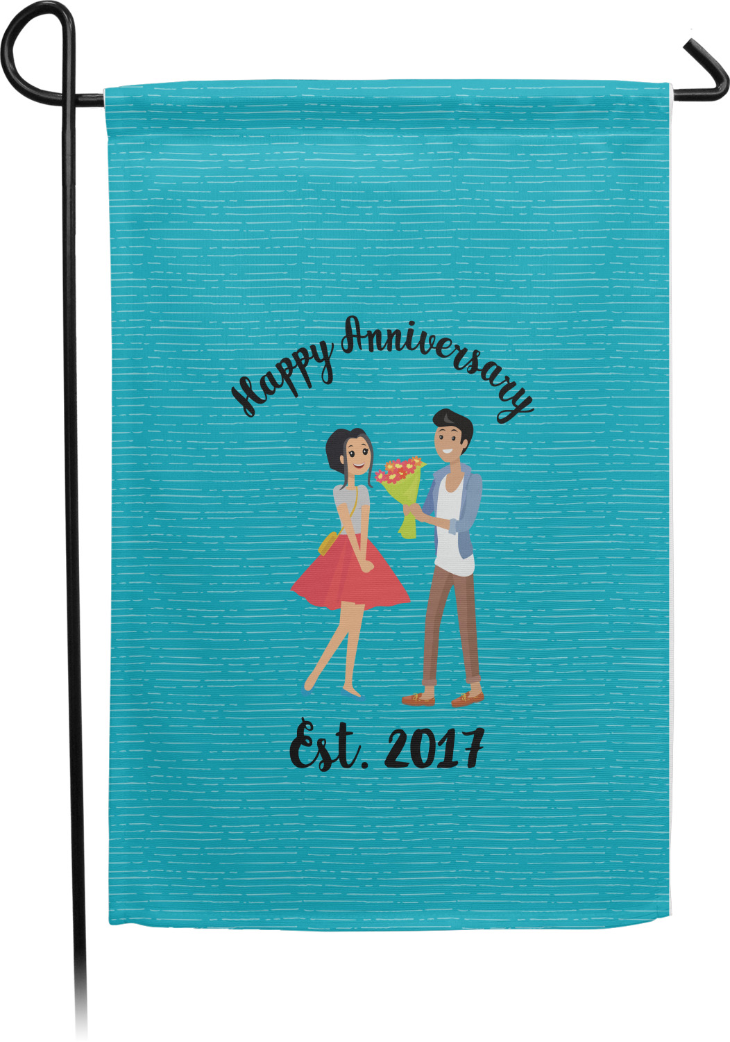 These custom garden flags are made of a durable, double-ply, polyester weave, allowing them to withstand the elements year round. The small flags measure at approximately 12 by 18 inches. The large flags measure out to 28 by 37 inches. You can order these decorative flags with your customization printed on the front only, or the front and back.