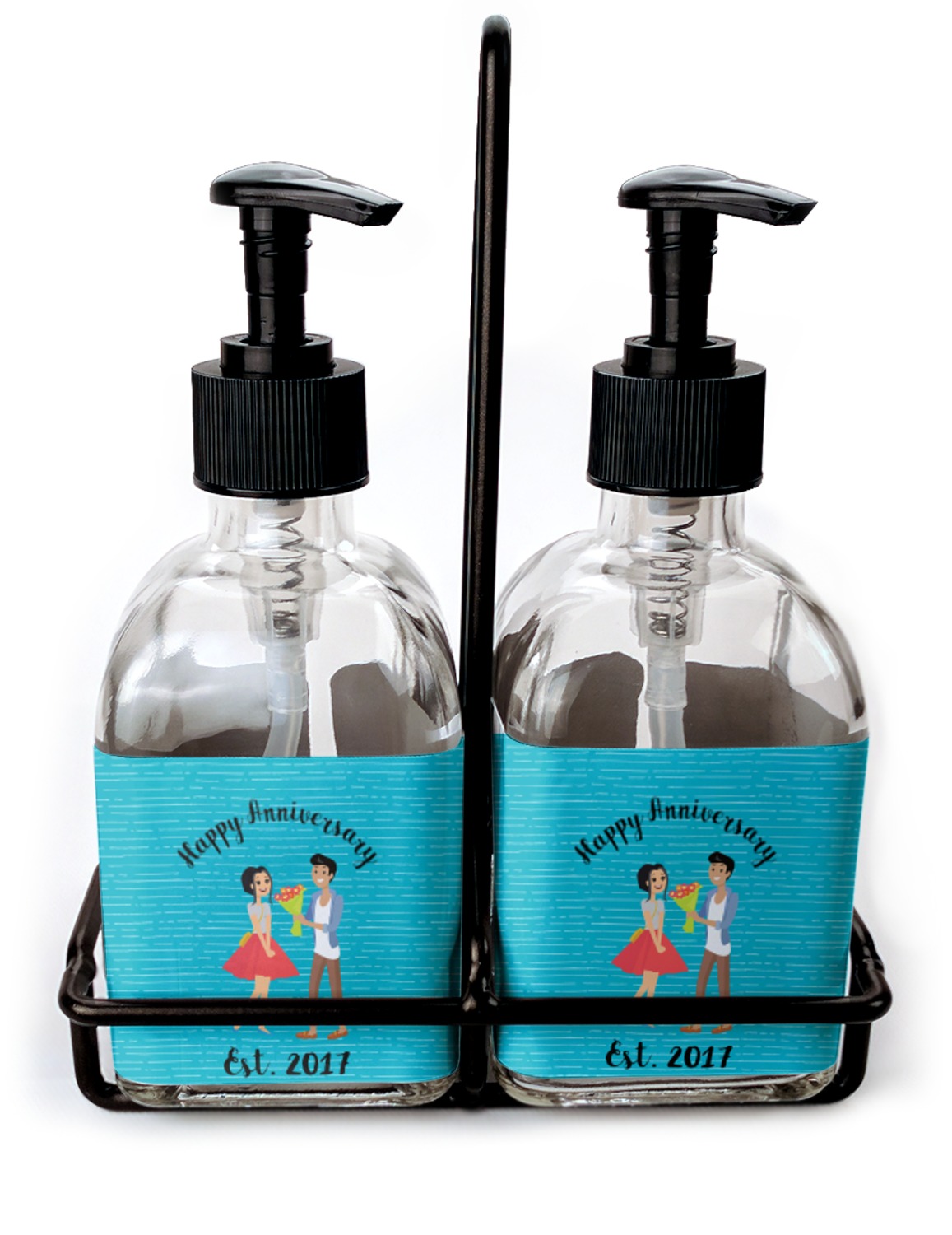 You can purchase these personalized soap dispensers as singulars, or as a set with two bottles. With your purchase of the set, we include a black frame that complements the black color of the pumps and adds to the overall classy look of the piece.