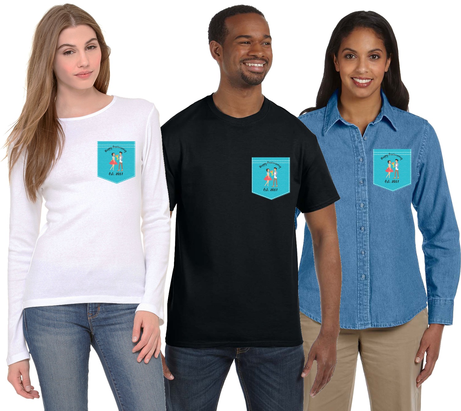 The faux pockets are available in 4 different sizes - for baby, kids, youth/women & men; the whole family can have the same pocket design, but sized just for them! The pockets are printed using our direct-to-film technology to the exact shape & size. We have faux stitching around the pocket, with double stitching on the top of the pocket to give it the authentic pocket look!