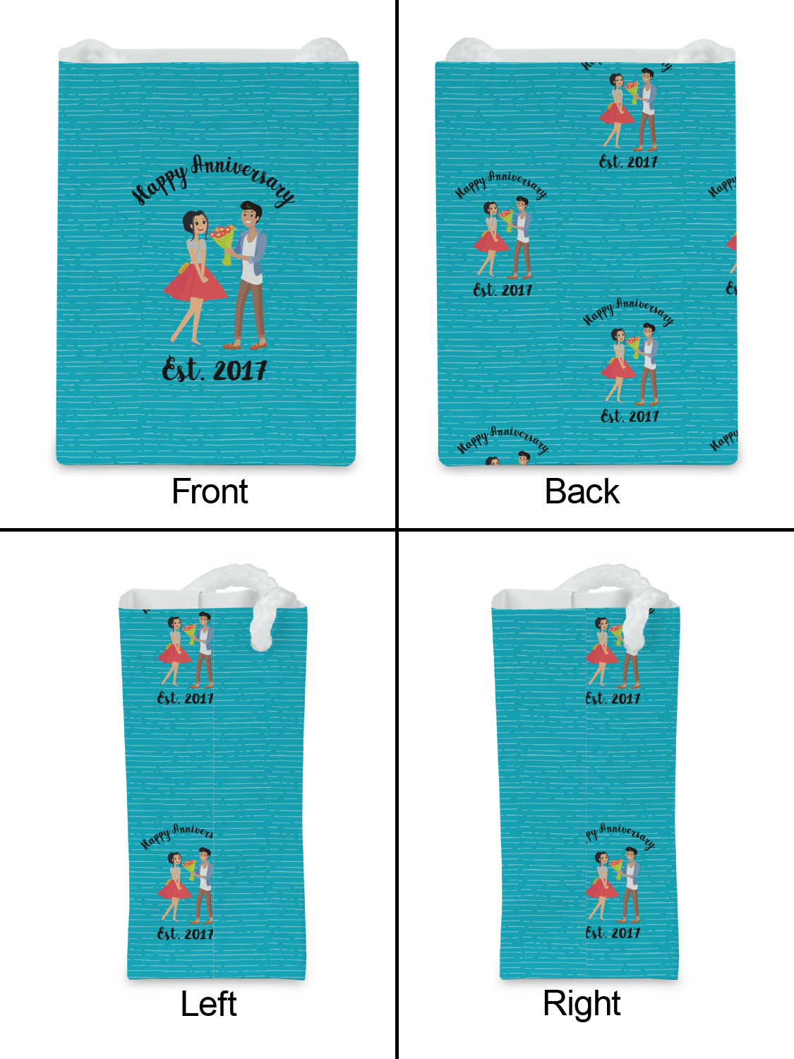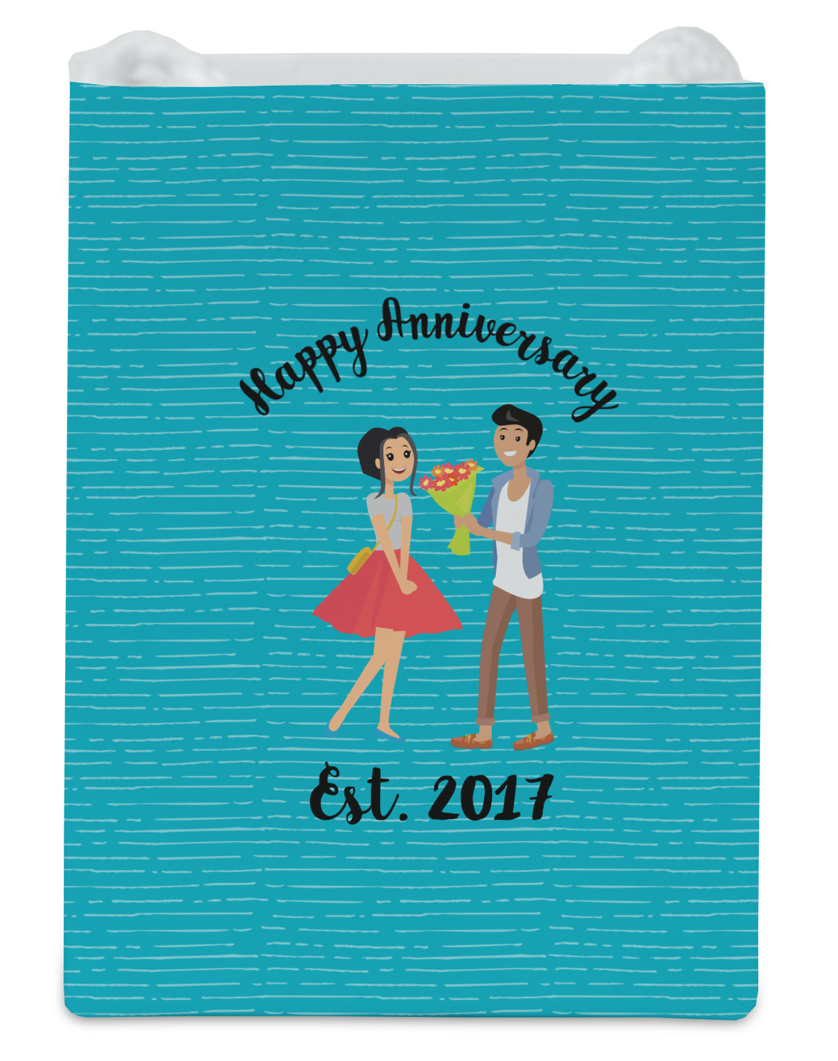 The design has a fun bright teal background with some subtle teal stripes running through. In the middle of the design is where your couple graphic is placed. Easily change the skin tone and hair color of this couple in love. Above and below the couple you can personalize the text to say "happy anniversary" or your names and your anniversary date. The coordinating design uses the couple graphic as a repeating pattern.