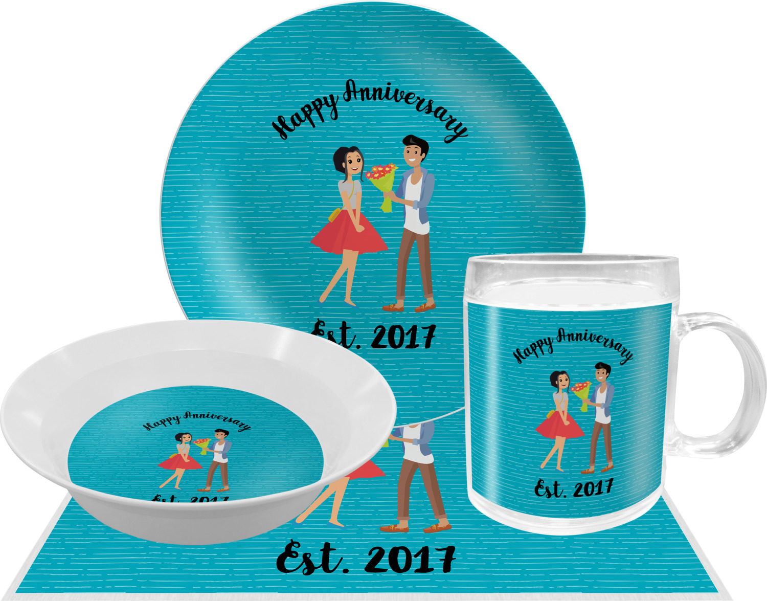 The design has a fun bright teal background with some subtle teal stripes running through. In the middle of the design is where your couple graphic is placed. Easily change the skin tone and hair color of this couple in love. Above and below the couple you can personalize the text to say "happy anniversary" or your names and your anniversary date. The coordinating design uses the couple graphic as a repeating pattern.