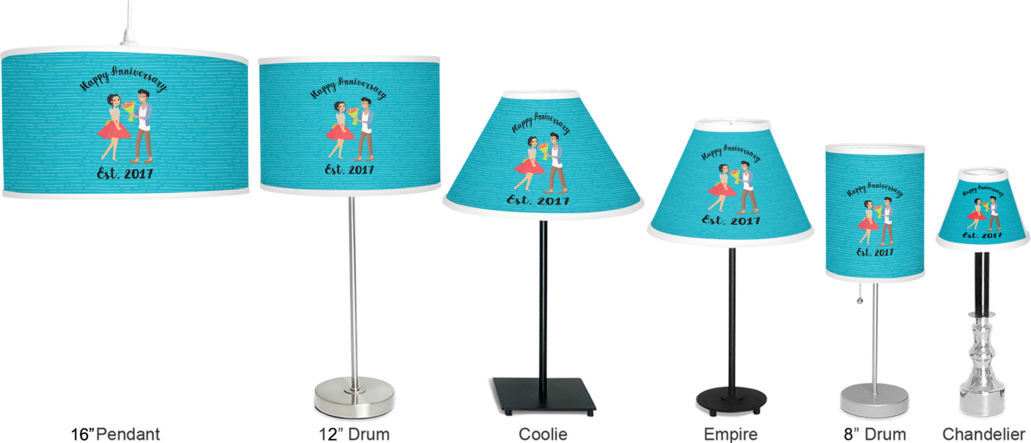 The design has a fun bright teal background with some subtle teal stripes running through. In the middle of the design is where your couple graphic is placed. Easily change the skin tone and hair color of this couple in love. Above and below the couple you can personalize the text to say "happy anniversary" or your names and your anniversary date. The coordinating design uses the couple graphic as a repeating pattern.