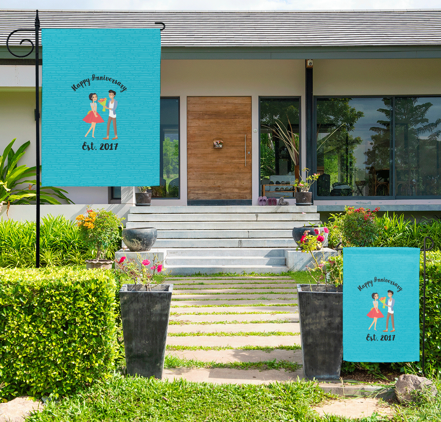 These custom garden flags are made of a durable, double-ply, polyester weave, allowing them to withstand the elements year round. The small flags measure at approximately 12 by 18 inches. The large flags measure out to 28 by 37 inches. You can order these decorative flags with your customization printed on the front only, or the front and back.