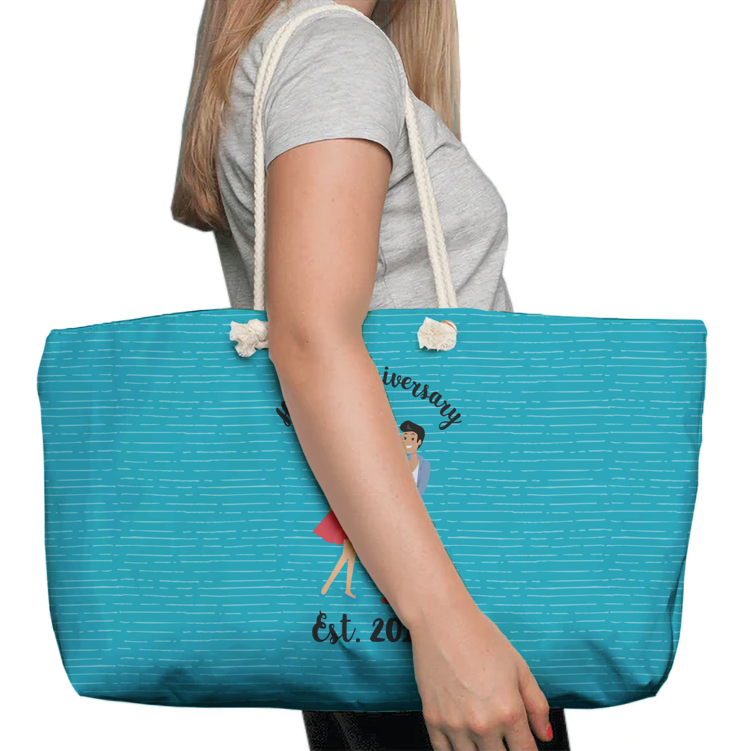 Our oversized weekender tote with rope handles is perfect for your weekend at the beach or on the town. This large tote are 24" W X 13" H, with a 5" gusset and a 27" thick rope handles with a knot that is put through a grommeted brass hole.