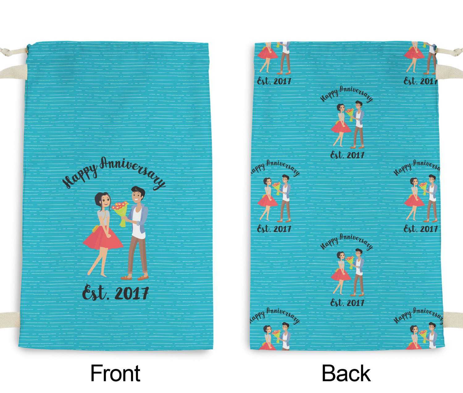 The design has a fun bright teal background with some subtle teal stripes running through. In the middle of the design is where your couple graphic is placed. Easily change the skin tone and hair color of this couple in love. Above and below the couple you can personalize the text to say "happy anniversary" or your names and your anniversary date. The coordinating design uses the couple graphic as a repeating pattern.