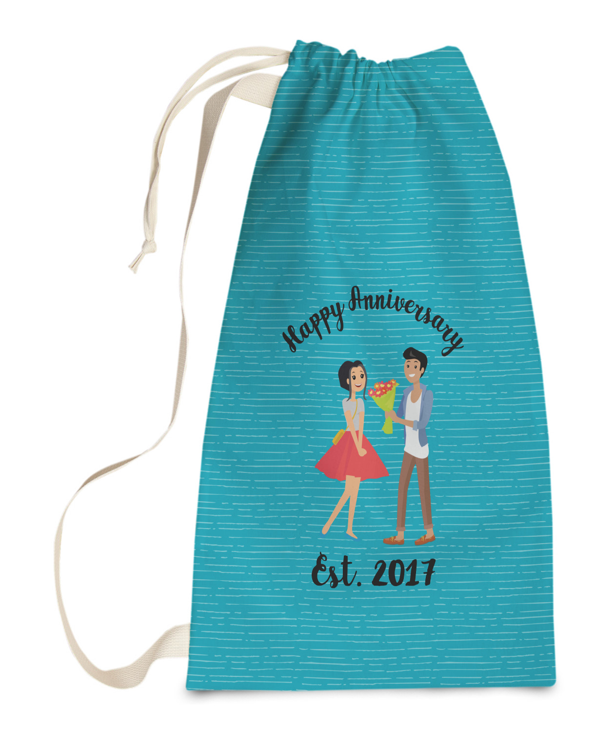Carry your laundry in style with these customized laundry bags. Available in two sizes, featuring a natural colored woven strap and a cinch cord, these bags hold a lot of clothes or anything else you want to fit in them.