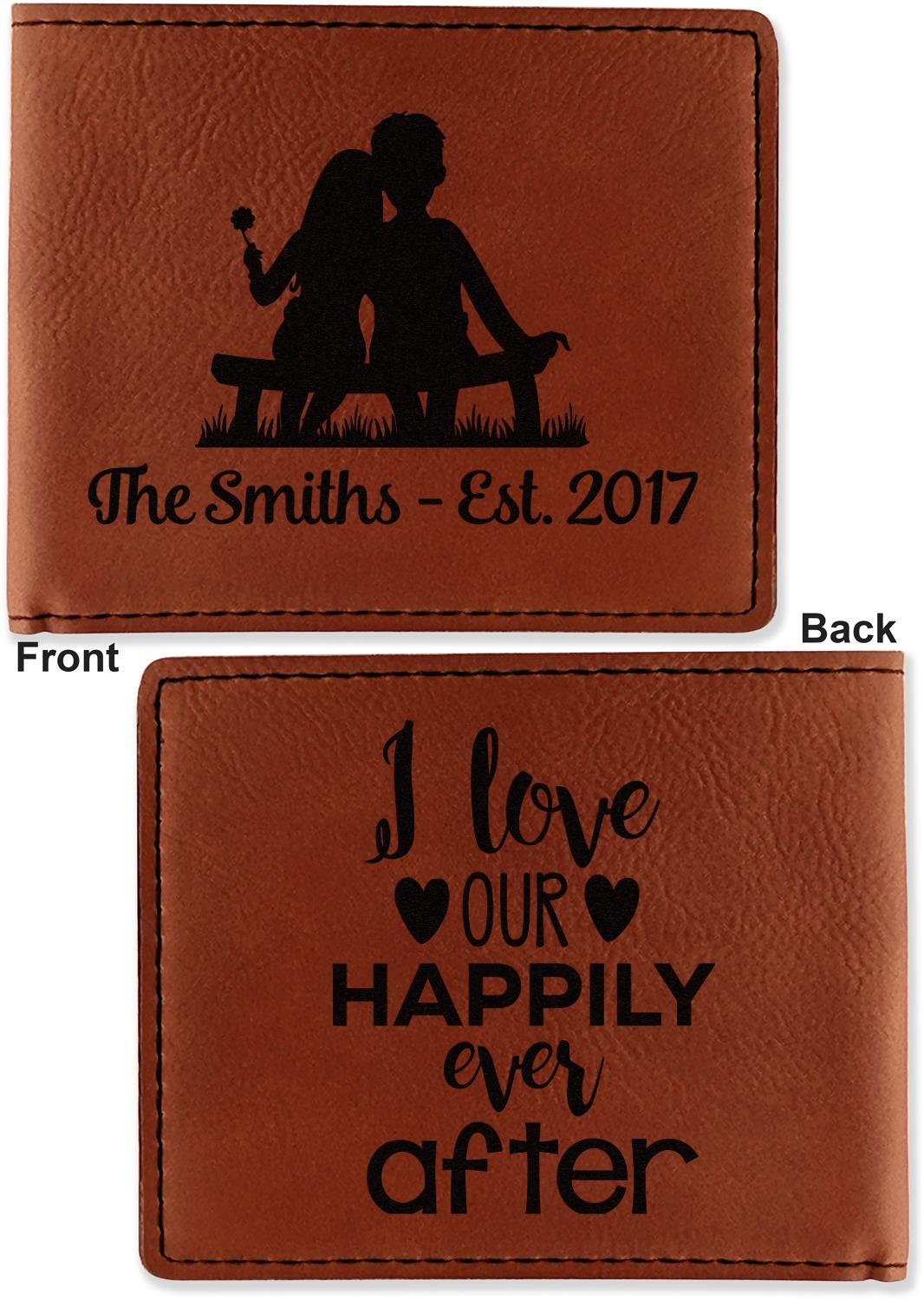 Your bifold wallet will be personalized by laser engraving, which will be a black color on the wallet. Choose a graphic, text, or monogram to personalize your wallet. There are thousands of choices in our design center.