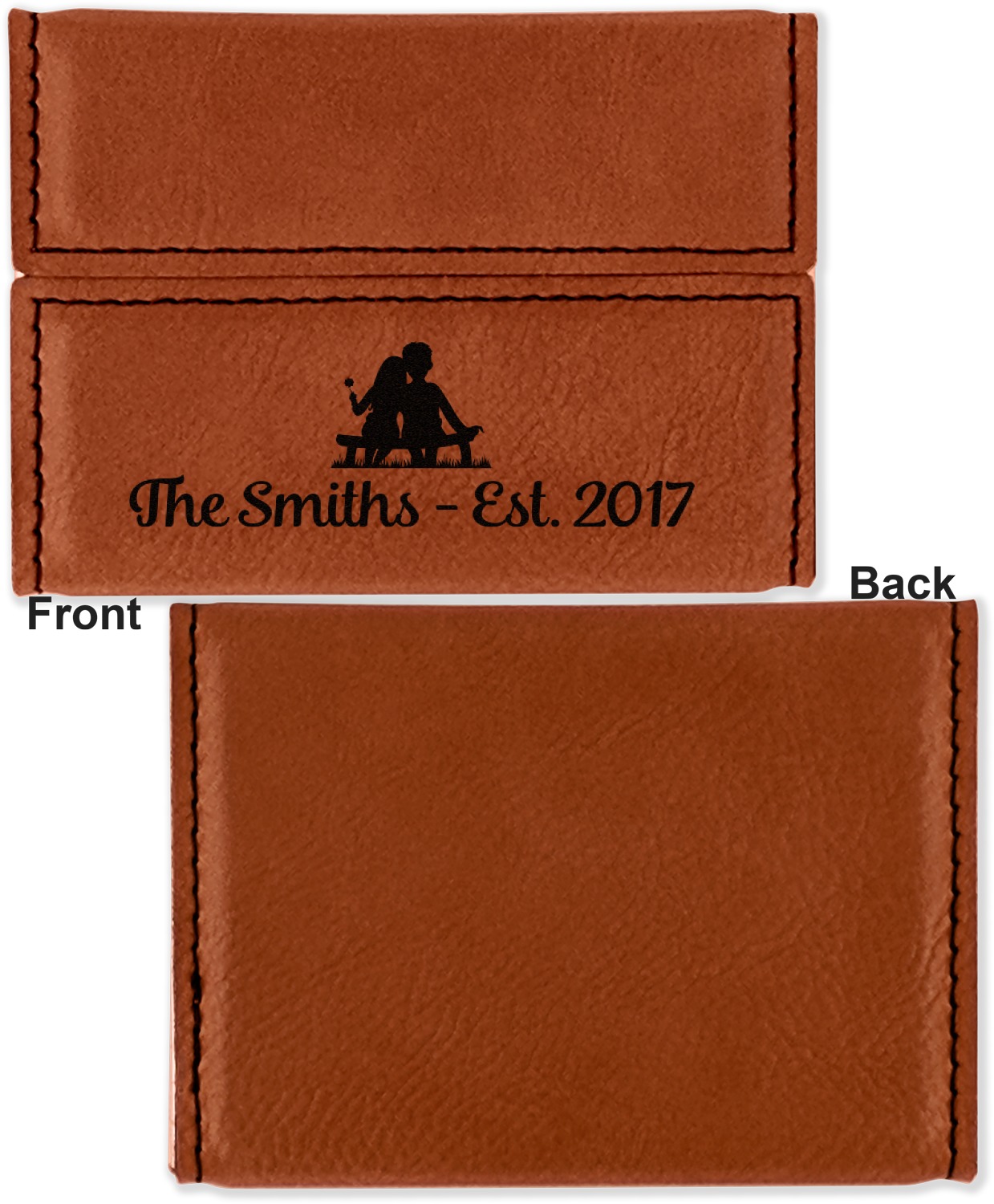 Your personalized design is laser engraved onto either the front, or the front and back of the card holder, depending on the model you purchase. Once engraved, the design will appear a darkened black against the cognac color of the leatherette.