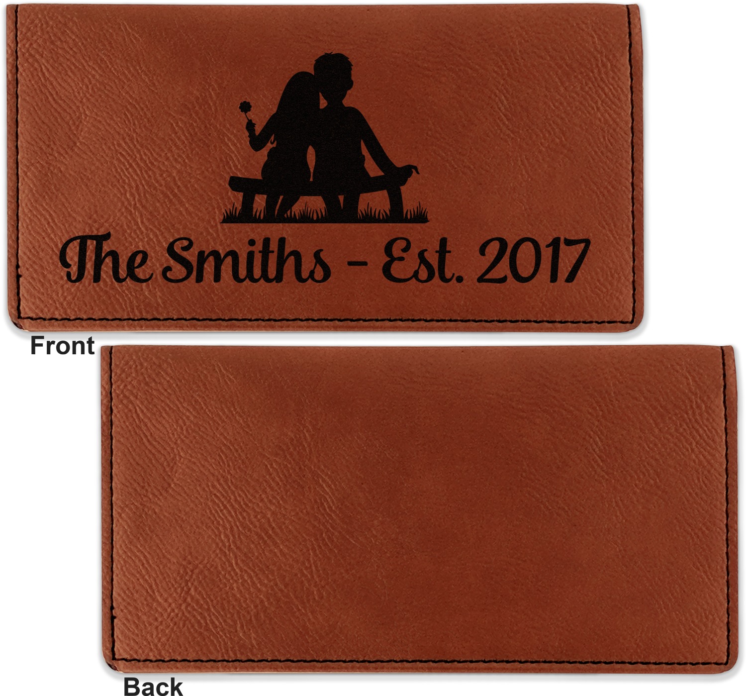 Go into our design center to start personalizing. Your checkbook cover will be laser engraved, making the graphic or text a black color. Choose a fun saying, monogram, or font to go on your checkbook cover. You have the opportunity to do it double or single sided.