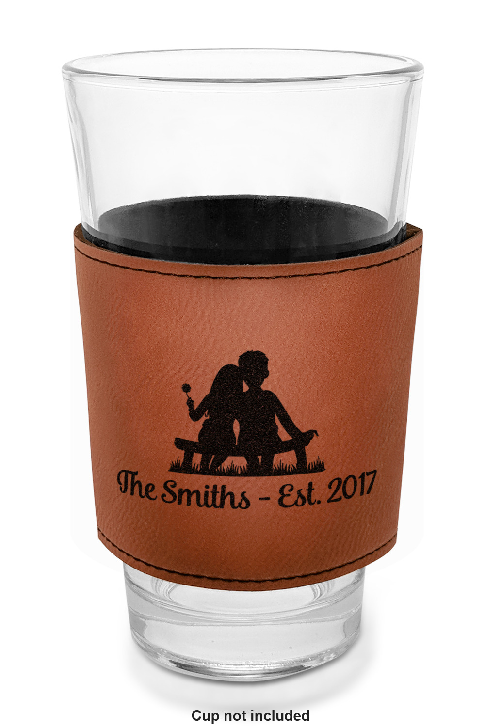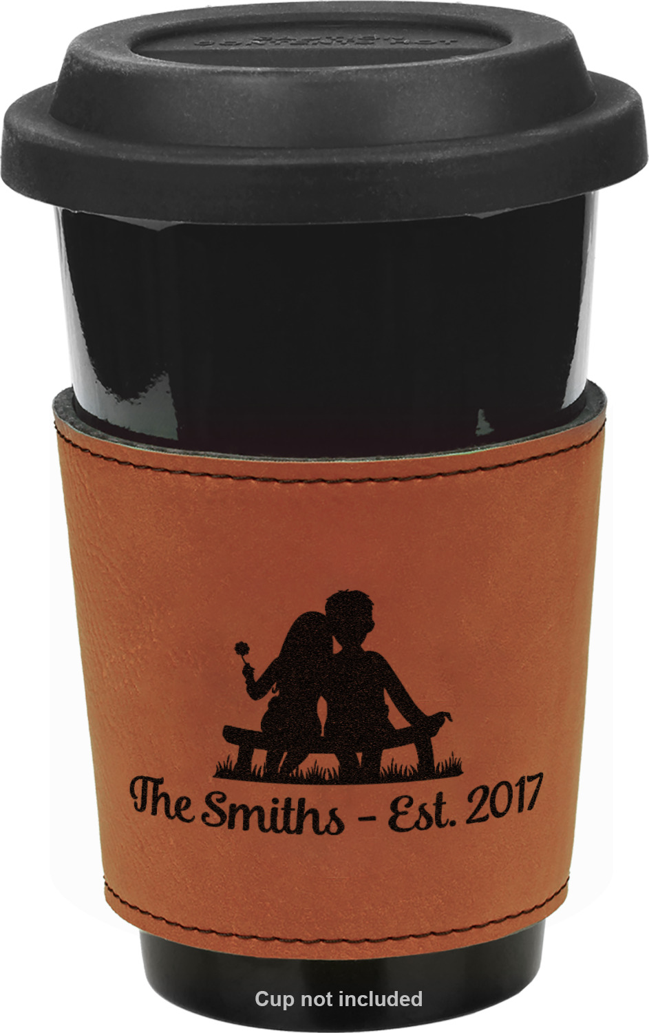 This cup sleeve is made from a suave, cognac-brown leatherette and finished with an intricate, black stitch. The interior of this can sleeve is fabricated from a thin foam material to help insulate your mug's contents. The sleeve is specifically made to suit tapered glasses or mugs, so the top's diameter is 3.5 inches, while the bottom's diameter is 2.75 inches. Your customized design will be laser engraved into the leatherette, leaving behind crisp, black imprint. With these products, we provide you with the option of engraving the front and back, or the front only.
