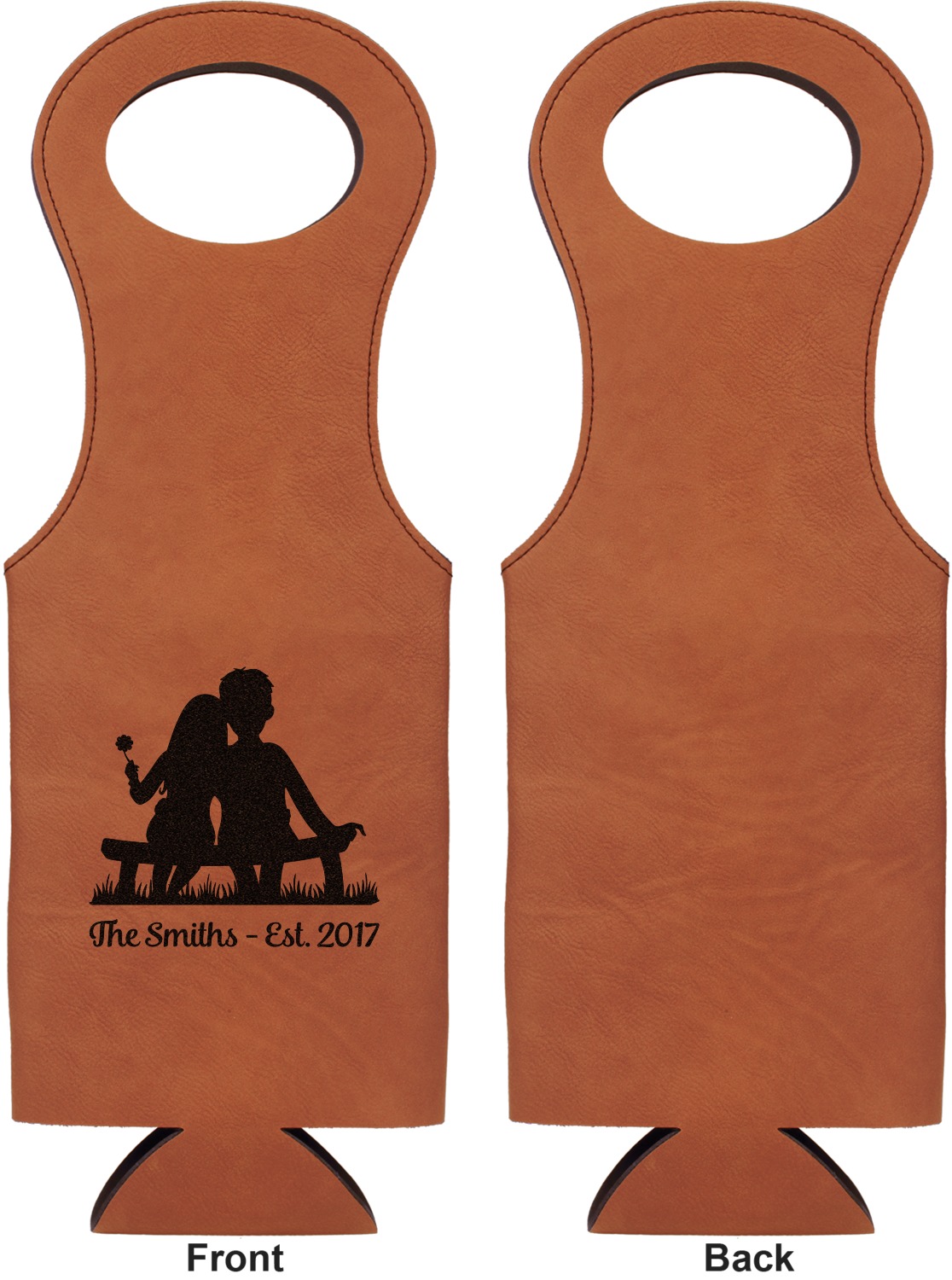 This wine carrier is made from a stunning leatherette, in a cognac-brown color. Strong, black stitching lines the sides of your wine bottle bag and provides extra durability. The interior is lined with a padded, black material to allow for a snug fit once your bottle is placed inside. At the top of this wine gift bag, you'll find two oval shaped handles that elegantly complements the rest of the bag's style. We provide you with the option of laser-engraving the front, or the front and back of your new personalized wine bag!