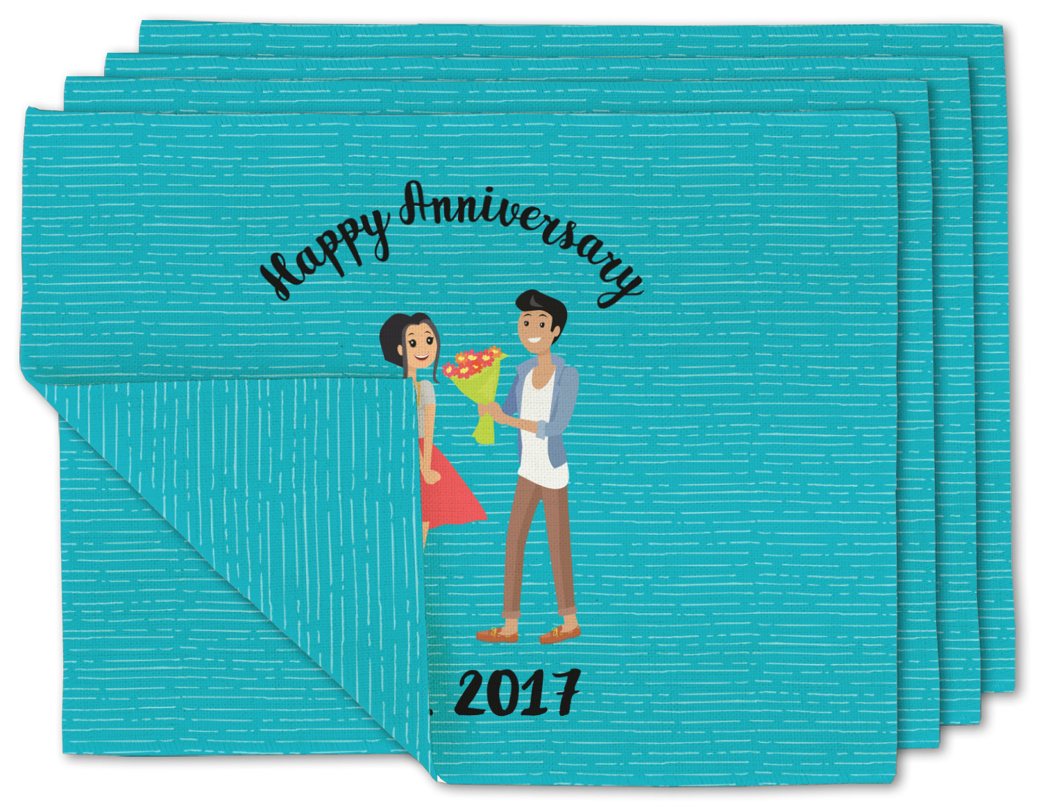 The design has a fun bright teal background with some subtle teal stripes running through. In the middle of the design is where your couple graphic is placed. Easily change the skin tone and hair color of this couple in love. Above and below the couple you can personalize the text to say "happy anniversary" or your names and your anniversary date. The coordinating design uses the couple graphic as a repeating pattern.