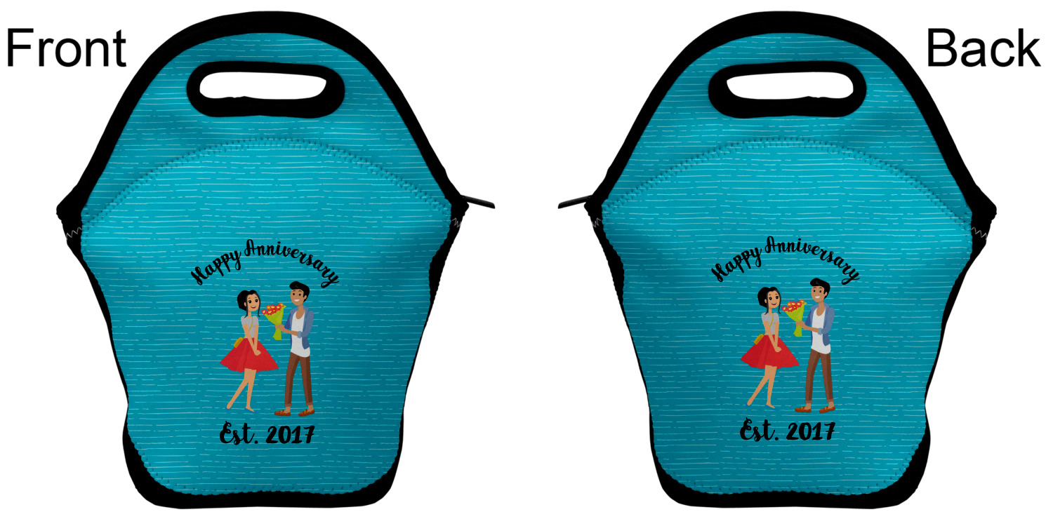 Our personalized lunch bags are made from a strong neoprene, and secure with a zipper closure that lines the top of the bag.The edges of the neoprene are sewn together with a heavy duty stitch, adding to the durability of the bag. The is accompanied by a reinforced handle at its top, for the easy transport of your lunch. We display your personalization across both the front and back of this neoprene lunch bag, while the remaining sides are a sleek black in color. Each bag measures at 13.5 inches tall, and 11.5 inches wide.