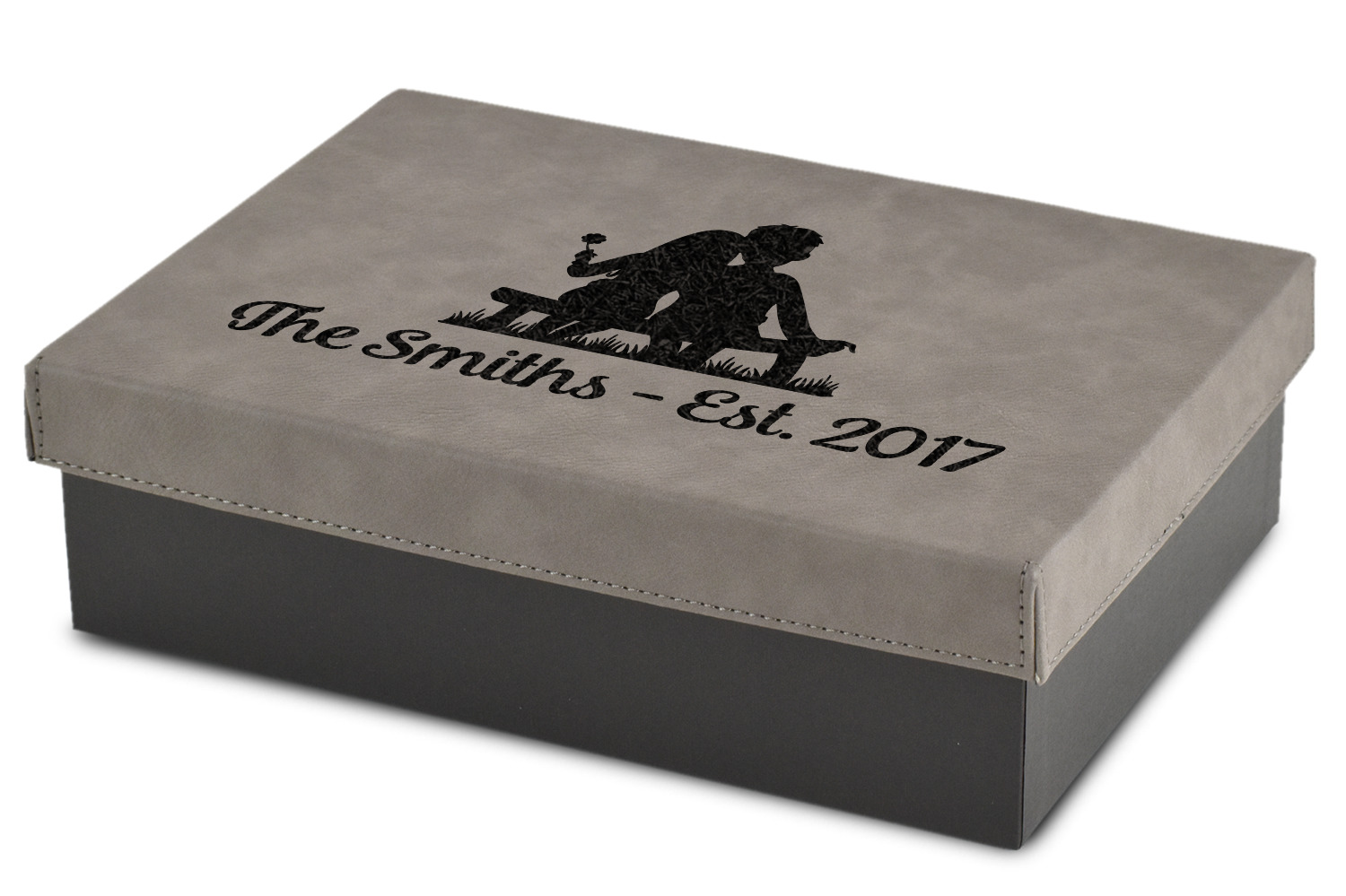 These gift boxes are available in 3 different sizes to accommodate various sized gifts. Available in gray as a neutral color for any occasion as well as to showcase your design boldly. Engraved with a laser this high quality paper board and faux leather gift box is unique and makes any gift stand out.