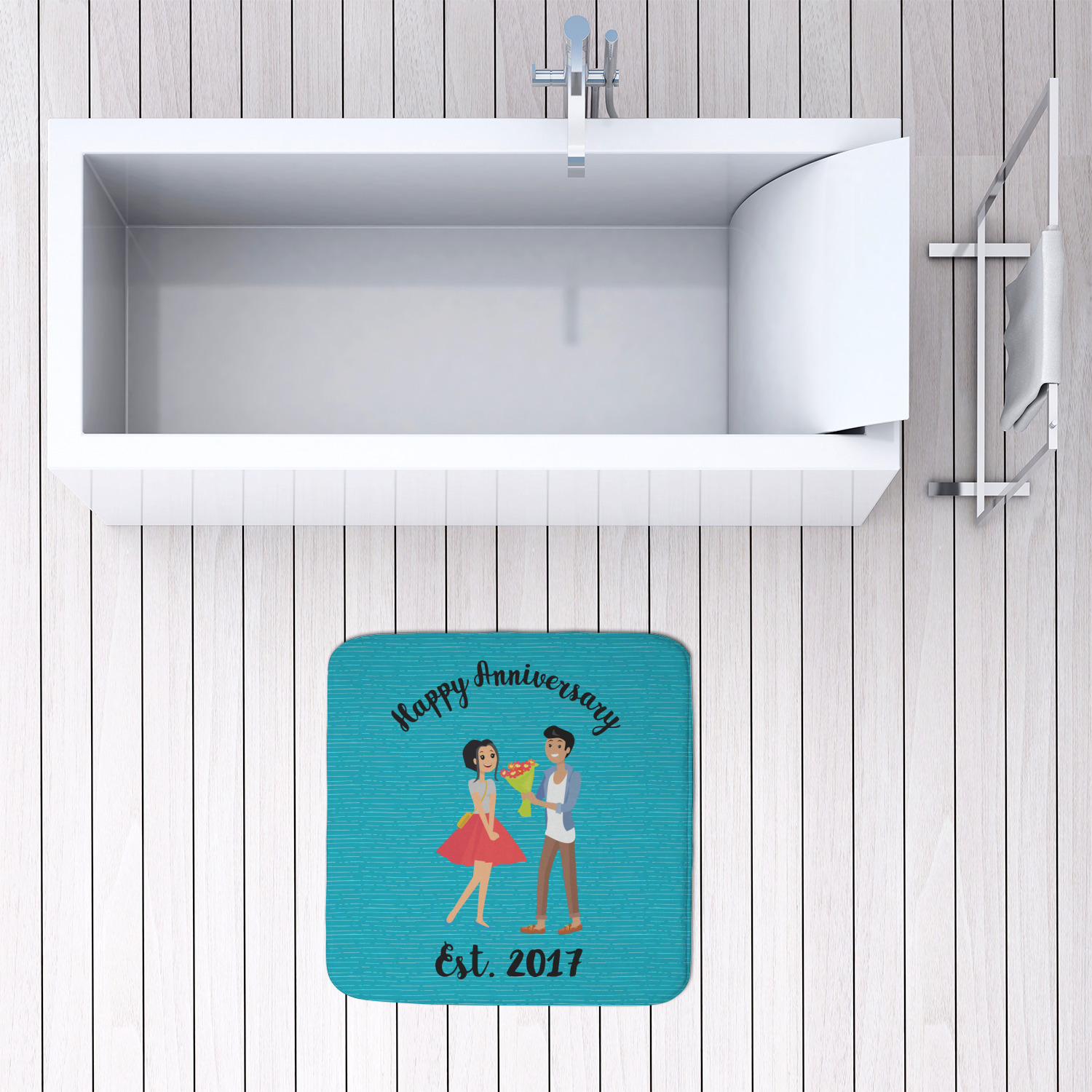We offer this custom bath mat in four different sizes, so that you can choose the proper size for your bathroom and shower space. We suggest measuring the area before so that you can make an informed purchase. The four sizes are as follows: 24 by 17 inches, 34 by 21 inches, 48 by 36 inches, and 48 by 48 inches.