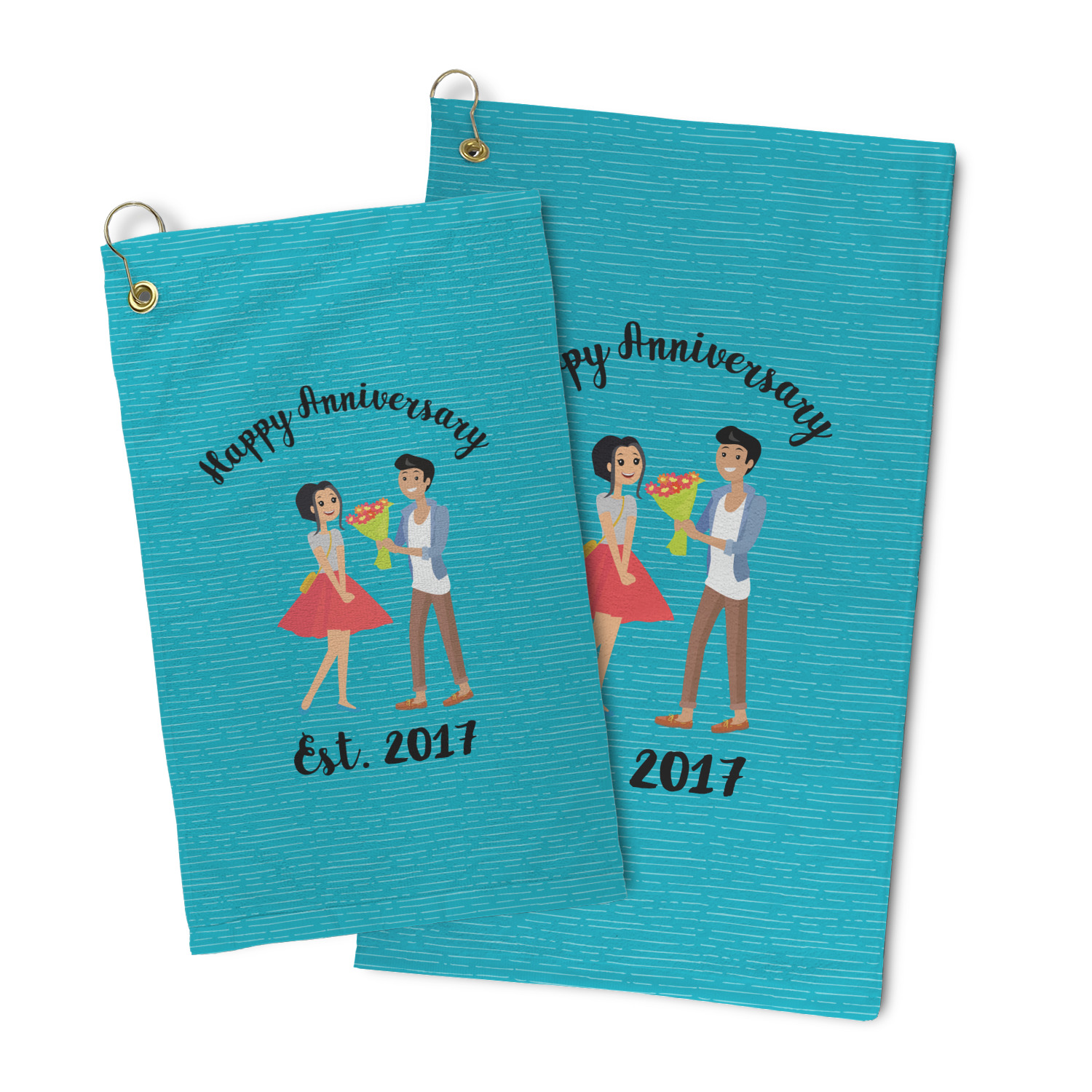 The design has a fun bright teal background with some subtle teal stripes running through. In the middle of the design is where your couple graphic is placed. Easily change the skin tone and hair color of this couple in love. Above and below the couple you can personalize the text to say "happy anniversary" or your names and your anniversary date. The coordinating design uses the couple graphic as a repeating pattern.