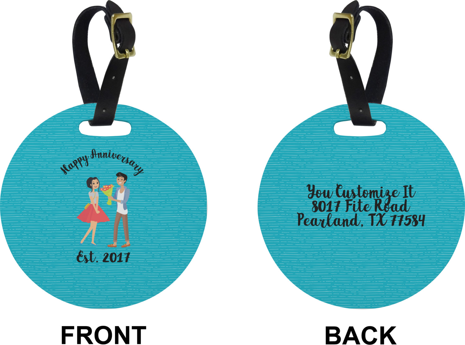 These personalized bag tags are sold in a variety of shapes, so that you may find the product that meets your vision exactly. We sell a round luggage tag, which measures at approximately 4" x 4". Our square luggage tag is about 3.5" x 3.5", while our rectangular version is 2.75" x 4 ".