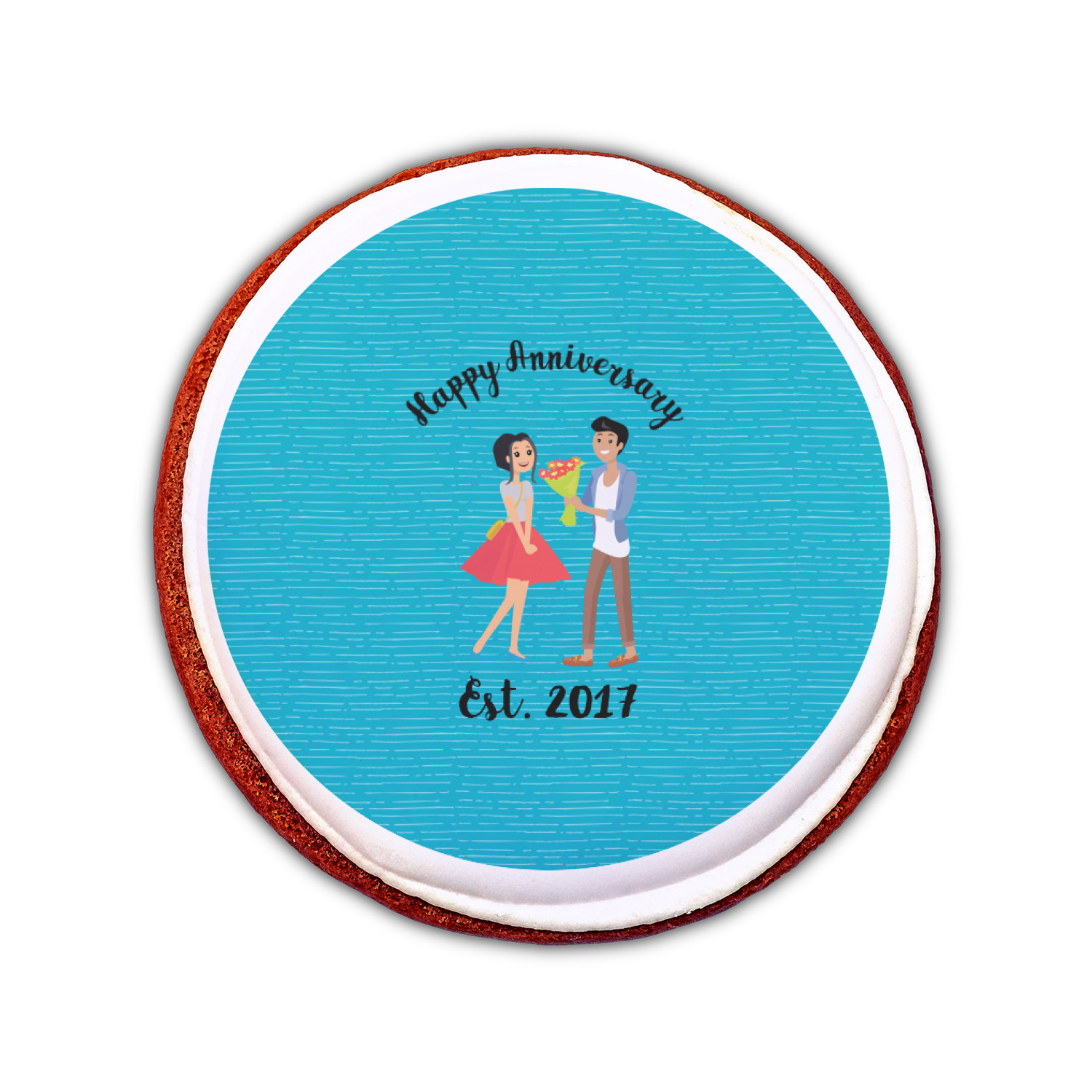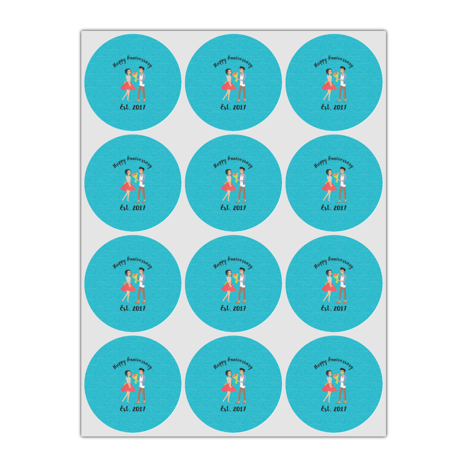 The design has a fun bright teal background with some subtle teal stripes running through. In the middle of the design is where your couple graphic is placed. Easily change the skin tone and hair color of this couple in love. Above and below the couple you can personalize the text to say "happy anniversary" or your names and your anniversary date. The coordinating design uses the couple graphic as a repeating pattern.