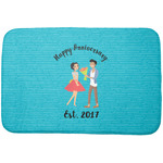 The design has a fun bright teal background with some subtle teal stripes running through. In the middle of the design is where your couple graphic is placed. Easily change the skin tone and hair color of this couple in love. Above and below the couple you can personalize the text to say "happy anniversary" or your names and your anniversary date. The coordinating design uses the couple graphic as a repeating pattern.