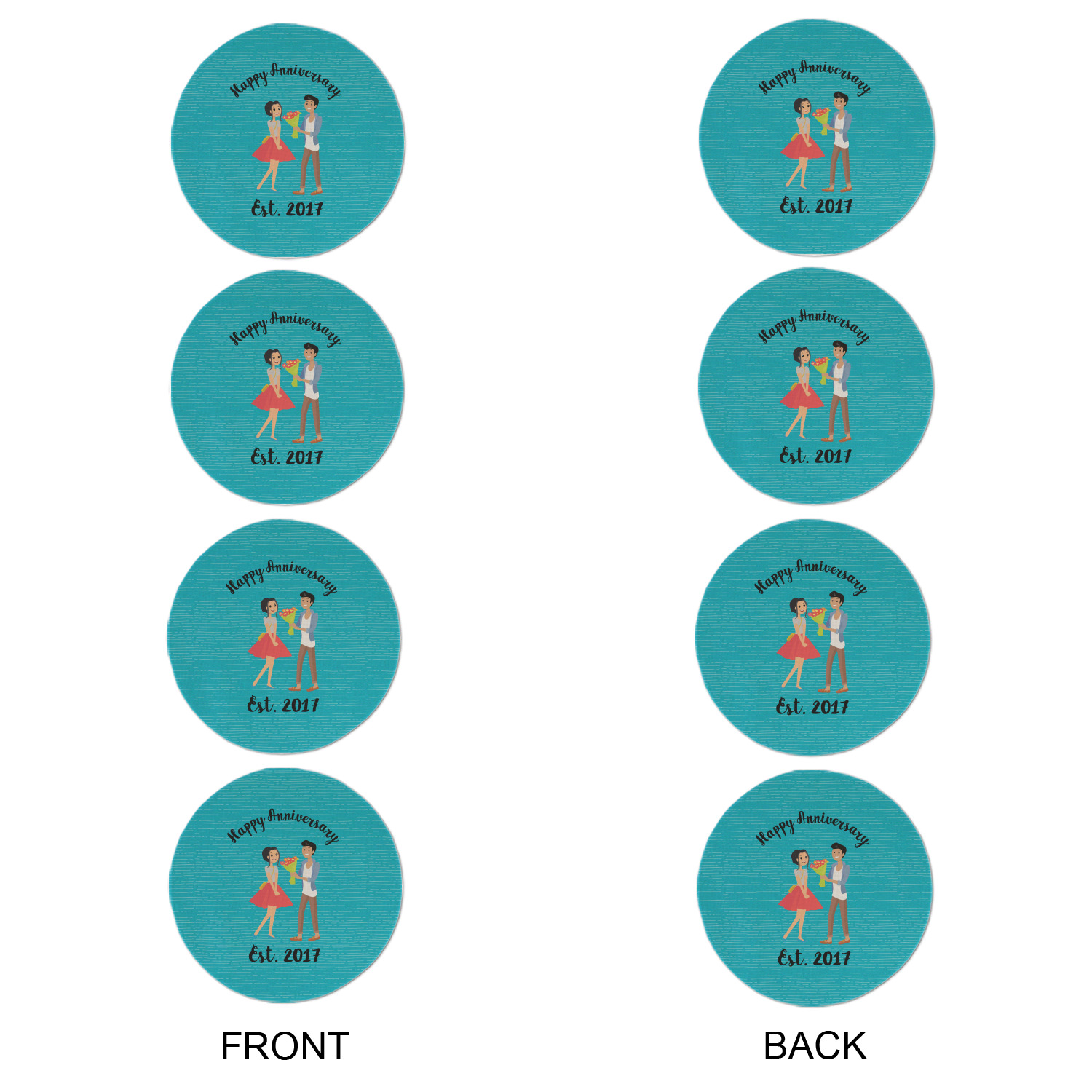 The design has a fun bright teal background with some subtle teal stripes running through. In the middle of the design is where your couple graphic is placed. Easily change the skin tone and hair color of this couple in love. Above and below the couple you can personalize the text to say "happy anniversary" or your names and your anniversary date. The coordinating design uses the couple graphic as a repeating pattern.