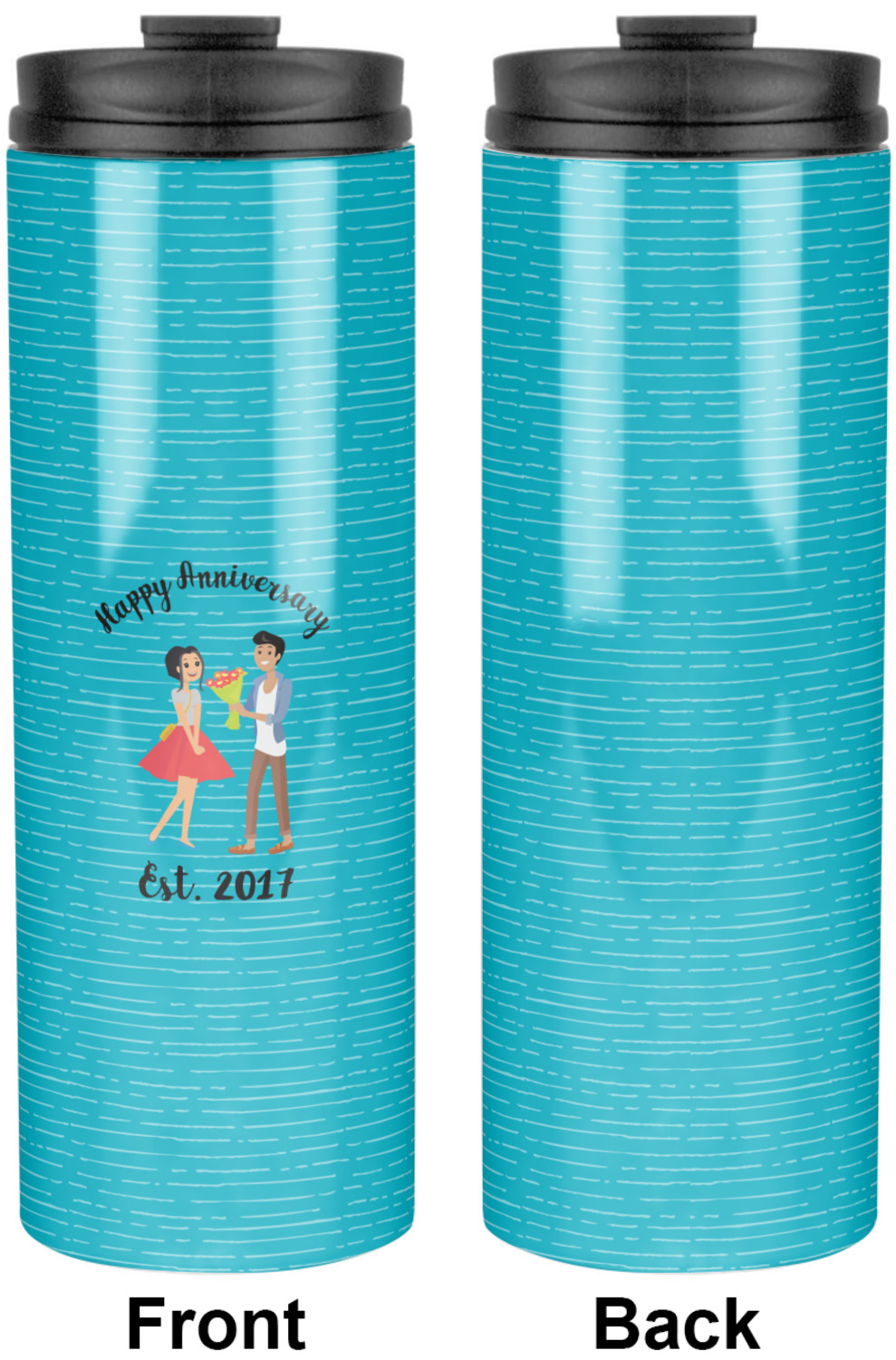 The design has a fun bright teal background with some subtle teal stripes running through. In the middle of the design is where your couple graphic is placed. Easily change the skin tone and hair color of this couple in love. Above and below the couple you can personalize the text to say "happy anniversary" or your names and your anniversary date. The coordinating design uses the couple graphic as a repeating pattern.