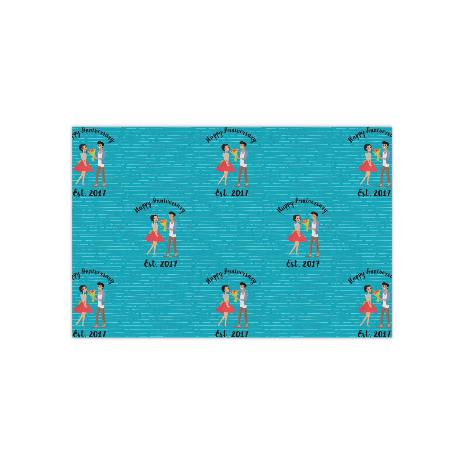 The design has a fun bright teal background with some subtle teal stripes running through. In the middle of the design is where your couple graphic is placed. Easily change the skin tone and hair color of this couple in love. Above and below the couple you can personalize the text to say "happy anniversary" or your names and your anniversary date. The coordinating design uses the couple graphic as a repeating pattern.