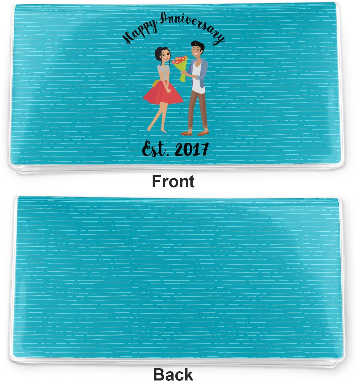 The design has a fun bright teal background with some subtle teal stripes running through. In the middle of the design is where your couple graphic is placed. Easily change the skin tone and hair color of this couple in love. Above and below the couple you can personalize the text to say "happy anniversary" or your names and your anniversary date. The coordinating design uses the couple graphic as a repeating pattern.