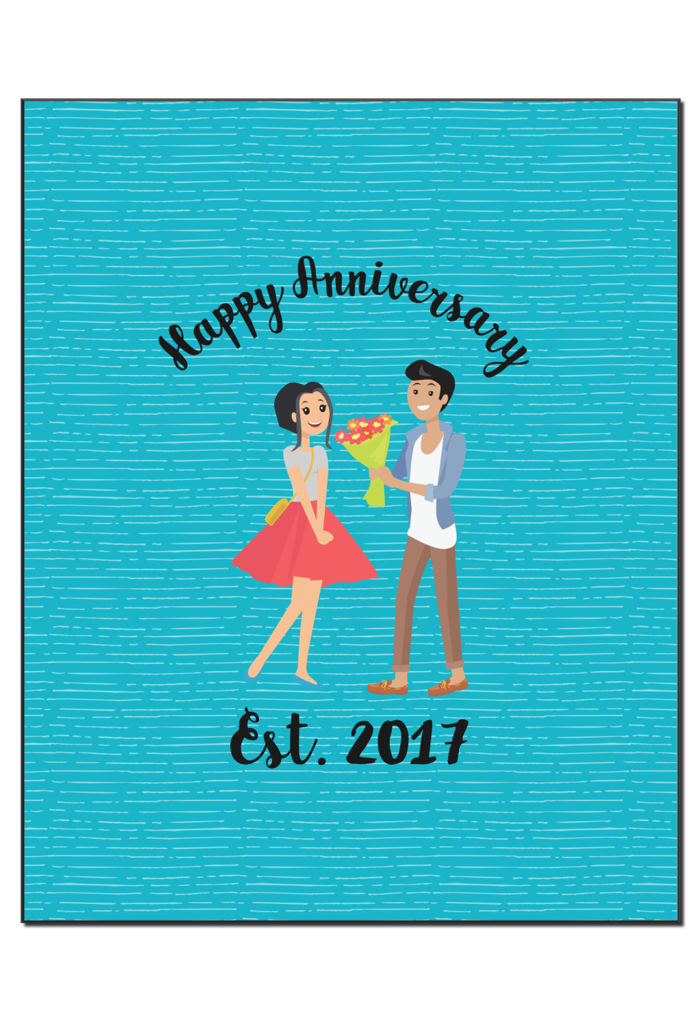 The design has a fun bright teal background with some subtle teal stripes running through. In the middle of the design is where your couple graphic is placed. Easily change the skin tone and hair color of this couple in love. Above and below the couple you can personalize the text to say "happy anniversary" or your names and your anniversary date. The coordinating design uses the couple graphic as a repeating pattern.