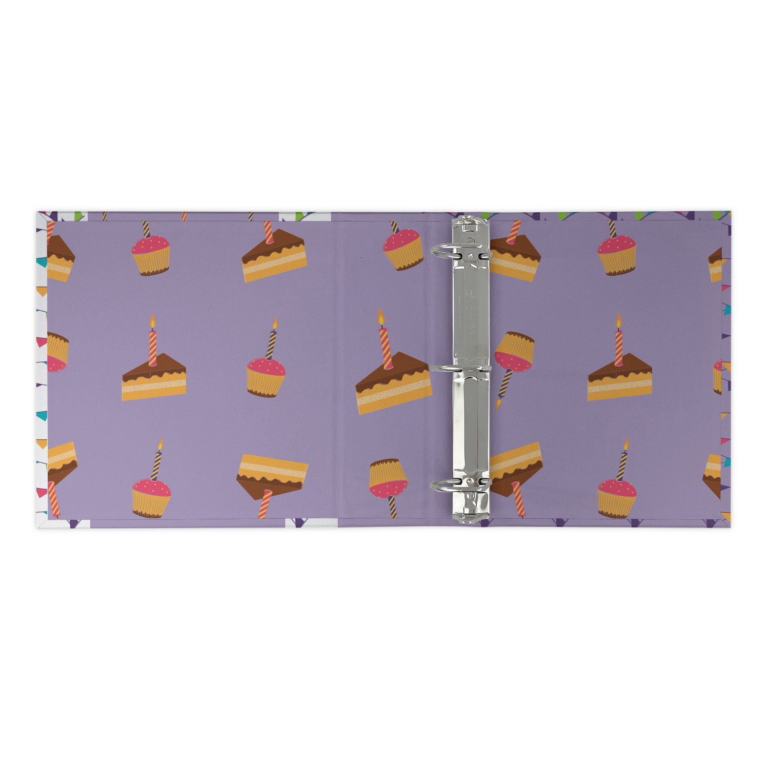 This design is filled with birthday party fun! The triangle birthday banners are a number of bright colors. Throughout the design you will find green, blue, yellow, pink, and mostly purple! The background is a fun lavender to contrast the pink cupcakes and yellow cake slices. This design in particular is divided up into three sections with two different patterns.