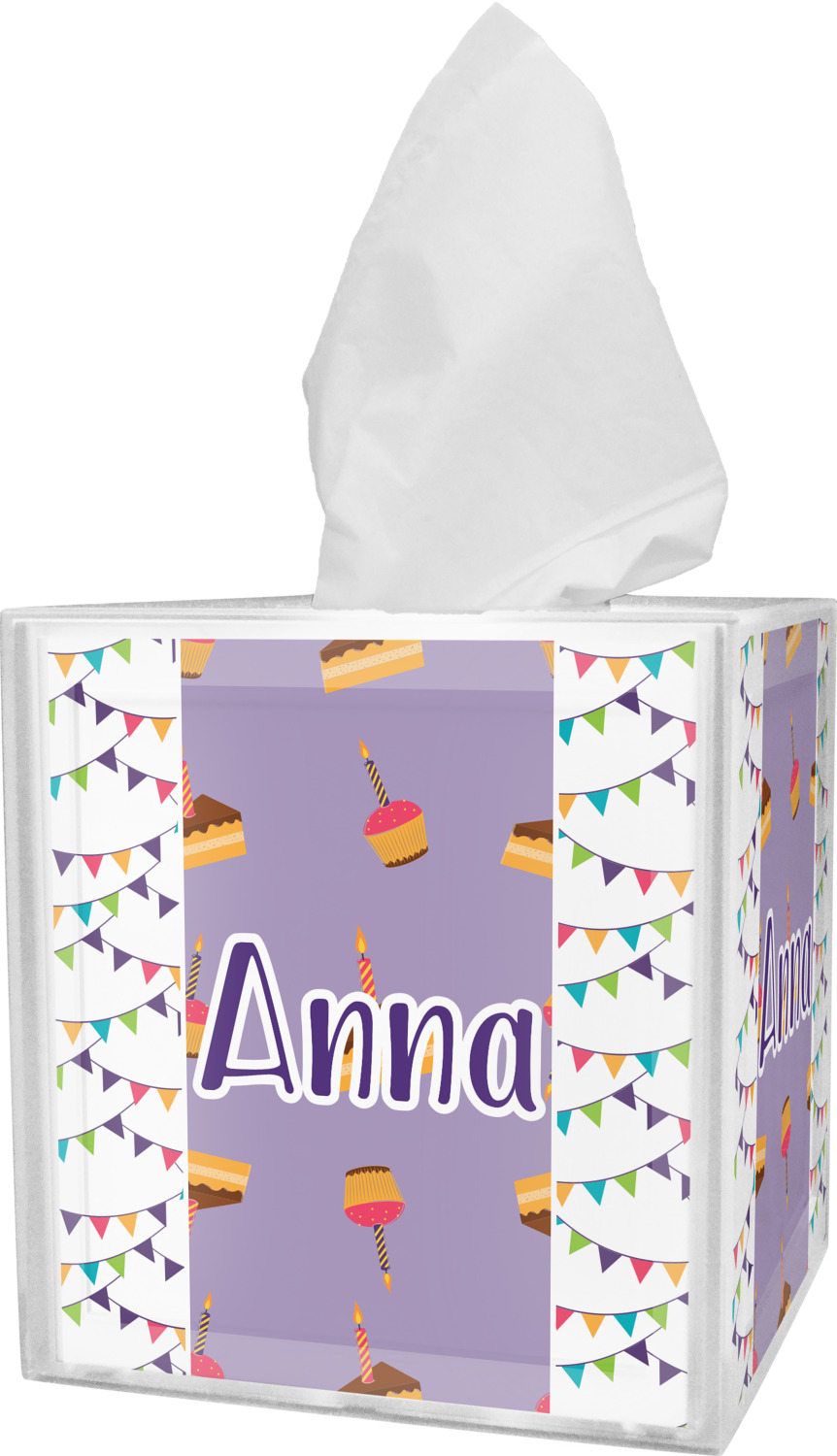 These tissue holders are built from durable acrylic and display your unique personalization on fine-quality vinyl inserts placed within the four sides and top. The box features two pieces, allowing you to easily switch out tissue boxes. On the sides, you'll find ridges that ensure the top and base fit securely in place. The bottom of these tissue box holders has four, rubber, non-slip pads to prevent the box from scuffing any surface you decide to display it on. Each box can fit a standard 5-by-5-inch box of tissues.