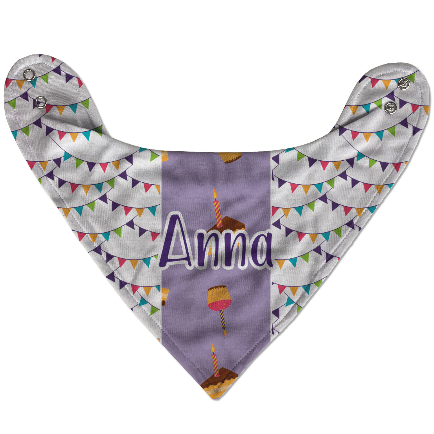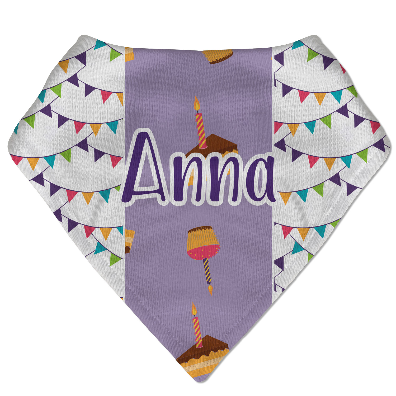 This design is filled with birthday party fun! The triangle birthday banners are a number of bright colors. Throughout the design you will find green, blue, yellow, pink, and mostly purple! The background is a fun lavender to contrast the pink cupcakes and yellow cake slices. This design in particular is divided up into three sections with two different patterns.