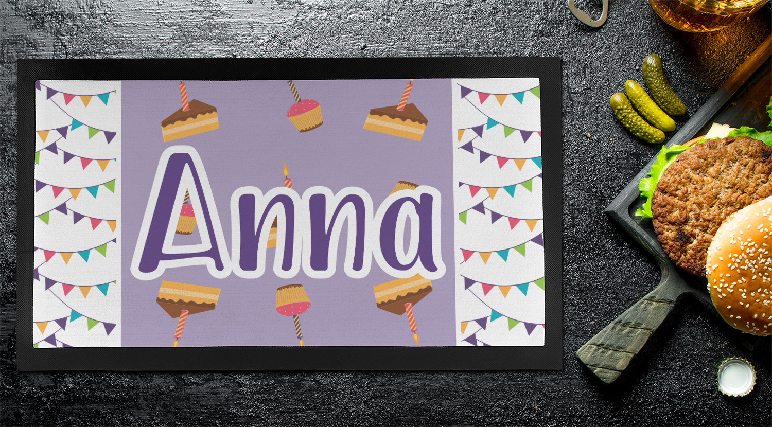 This design is filled with birthday party fun! The triangle birthday banners are a number of bright colors. Throughout the design you will find green, blue, yellow, pink, and mostly purple! The background is a fun lavender to contrast the pink cupcakes and yellow cake slices. This design in particular is divided up into three sections with two different patterns.
