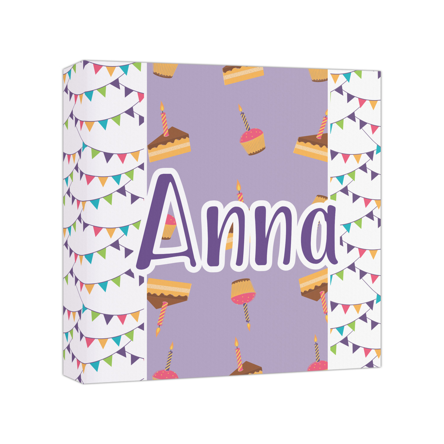 This design is filled with birthday party fun! The triangle birthday banners are a number of bright colors. Throughout the design you will find green, blue, yellow, pink, and mostly purple! The background is a fun lavender to contrast the pink cupcakes and yellow cake slices. This design in particular is divided up into three sections with two different patterns.